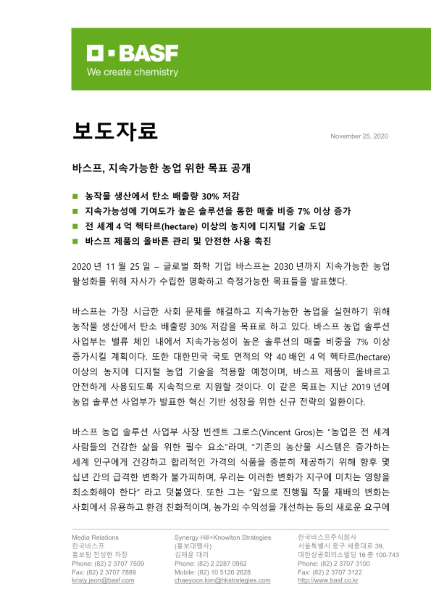 2020년 11월 25일 – 글로벌 화학 기업 바스프는 2030년까지 지속가능한 농업 활성화를 위해 자사가 수립한 명확하고 측정가능한 목표들을 발표했다.