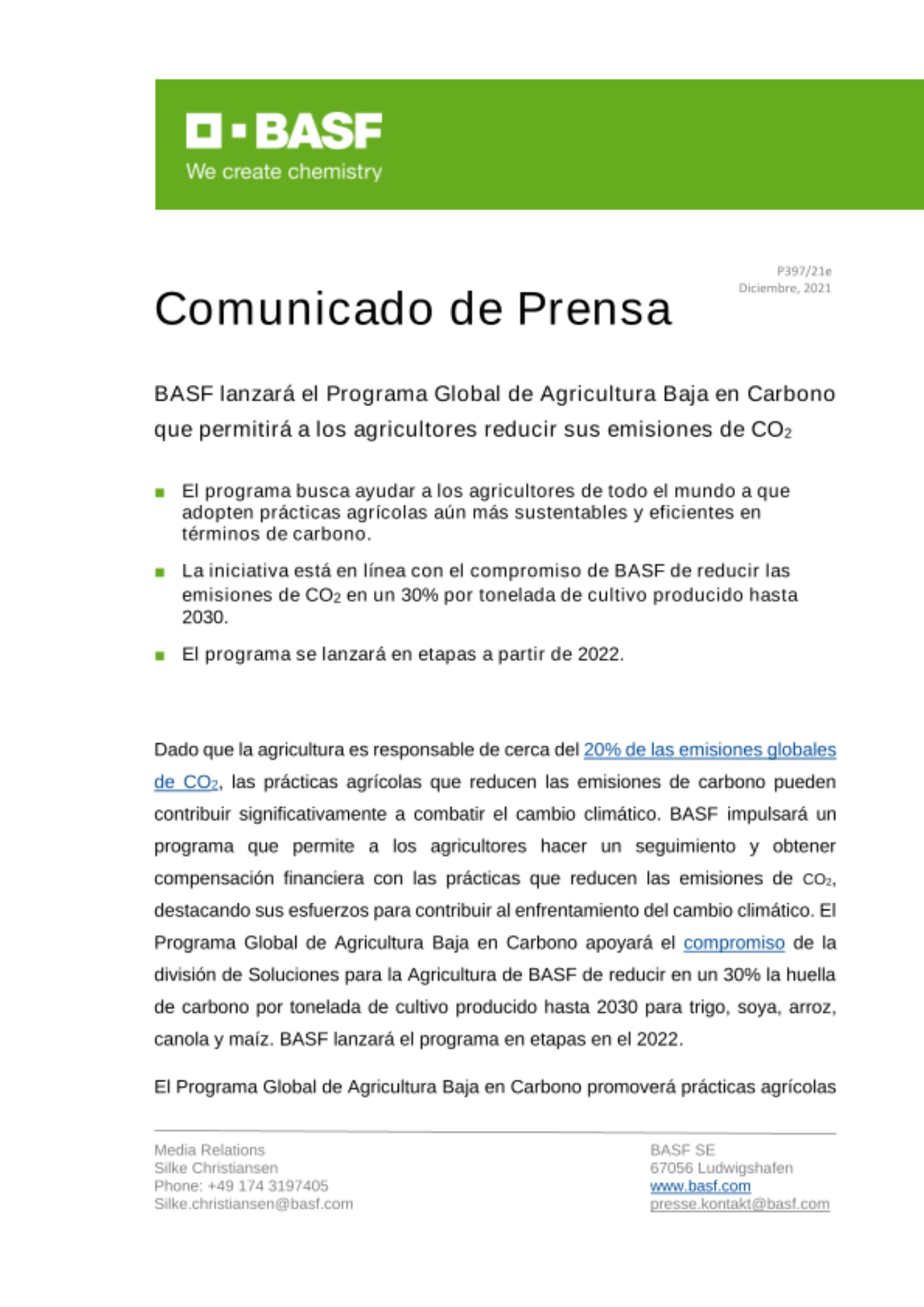 Dado que la agricultura es responsable de cerca del 20% de las emisiones globales de CO2, las prácticas agrícolas que reducen las emisiones de carbono pueden contribuir significativamente a combatir el cambio climático. BASF impulsará un programa que permite a los agricultores hacer un seguimiento y obtener compensación financiera con las prácticas que reducen las emisiones de CO2, destacando sus esfuerzos para contribuir al enfrentamiento del cambio climático. El Programa Global de Agricultura Baja en Carbono apoyará el compromiso de la división de Soluciones para la Agricultura de BASF de reducir en un 30% la huella de carbono por tonelada de cultivo producido hasta 2030 para trigo, soya, arroz, canola y maíz. BASF lanzará el programa en etapas en el 2022.