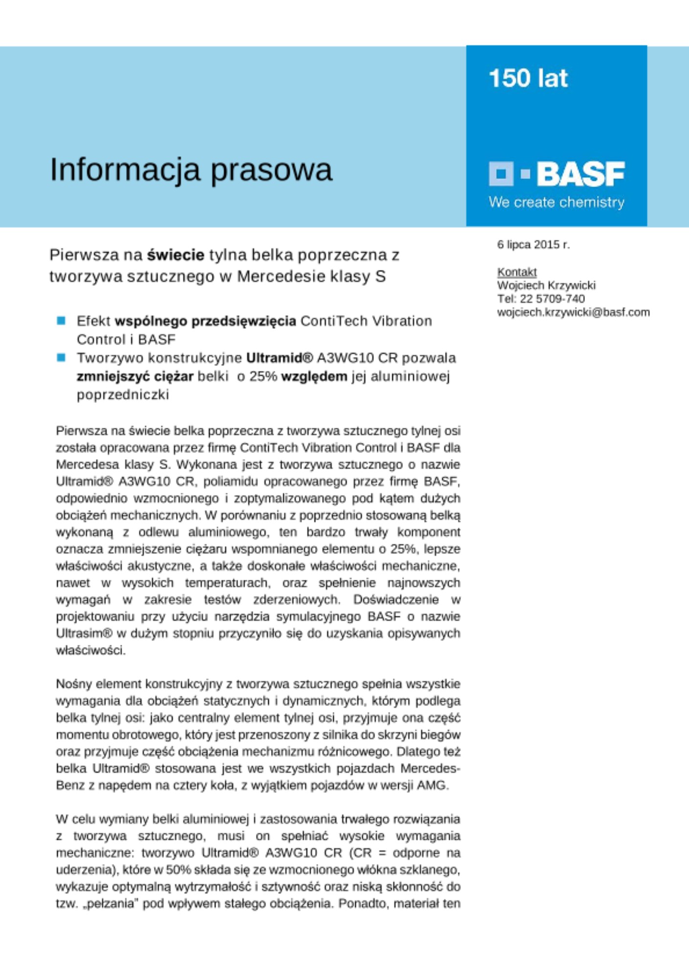 Pierwsza na świecie belka poprzeczna z tworzywa sztucznego tylnej osi została opracowana przez firmę ContiTech Vibration Control i BASF dla Mercedesa klasy S. Wykonana jest z tworzywa sztucznego o nazwie Ultramid® A3WG10 CR, poliamidu opracowanego przez firmę BASF, odpowiednio wzmocnionego i zoptymalizowanego pod kątem dużych obciążeń mechanicznych. W porównaniu z poprzednio stosowaną belką wykonaną z odlewu aluminiowego, ten bardzo trwały komponent oznacza zmniejszenie ciężaru wspomnianego elementu o 25%, lepsze właściwości akustyczne, a także doskonałe właściwości mechaniczne, nawet w wysokich temperaturach, oraz spełnienie najnowszych wymagań w zakresie testów zderzeniowych. Doświadczenie w projektowaniu przy użyciu narzędzia symulacyjnego BASF o nazwie Ultrasim® w dużym stopniu przyczyniło się do uzyskania opisywanych właściwości.