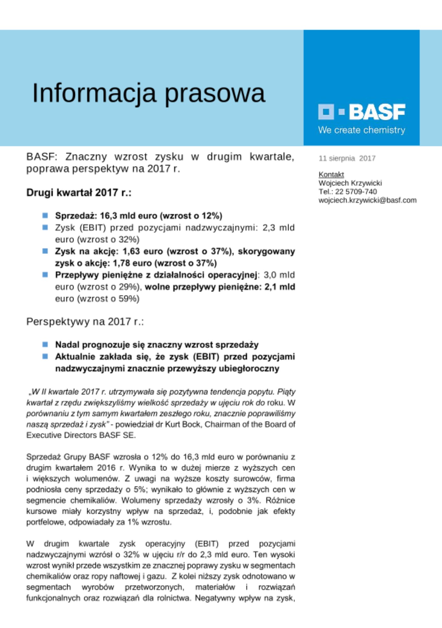 W drugim kwartale zysk operacyjny (EBIT) przed pozycjami nadzwyczajnymi wzrósł o 32% w ujęciu r/r do 2,3 mld euro. Ten wysoki wzrost wynikł przede wszystkim ze znacznej poprawy zysku w segmentach chemikaliów oraz ropy naftowej i gazu. Z kolei niższy zysk odnotowano w segmentach wyrobów przetworzonych, materiałów i rozwiązań funkcjonalnych oraz rozwiązań dla rolnictwa. Negatywny wpływ na zysk, jaki miał wypadek w porcie północnym w zakładzie w Ludwigshafen w październiku 2016 r. zrównoważyła wypłata odszkodowania z polisy ubezpieczeniowej w wysokości 100 mln euro, która została w dużej mierze zaksięgowana w segmencie chemikaliów.