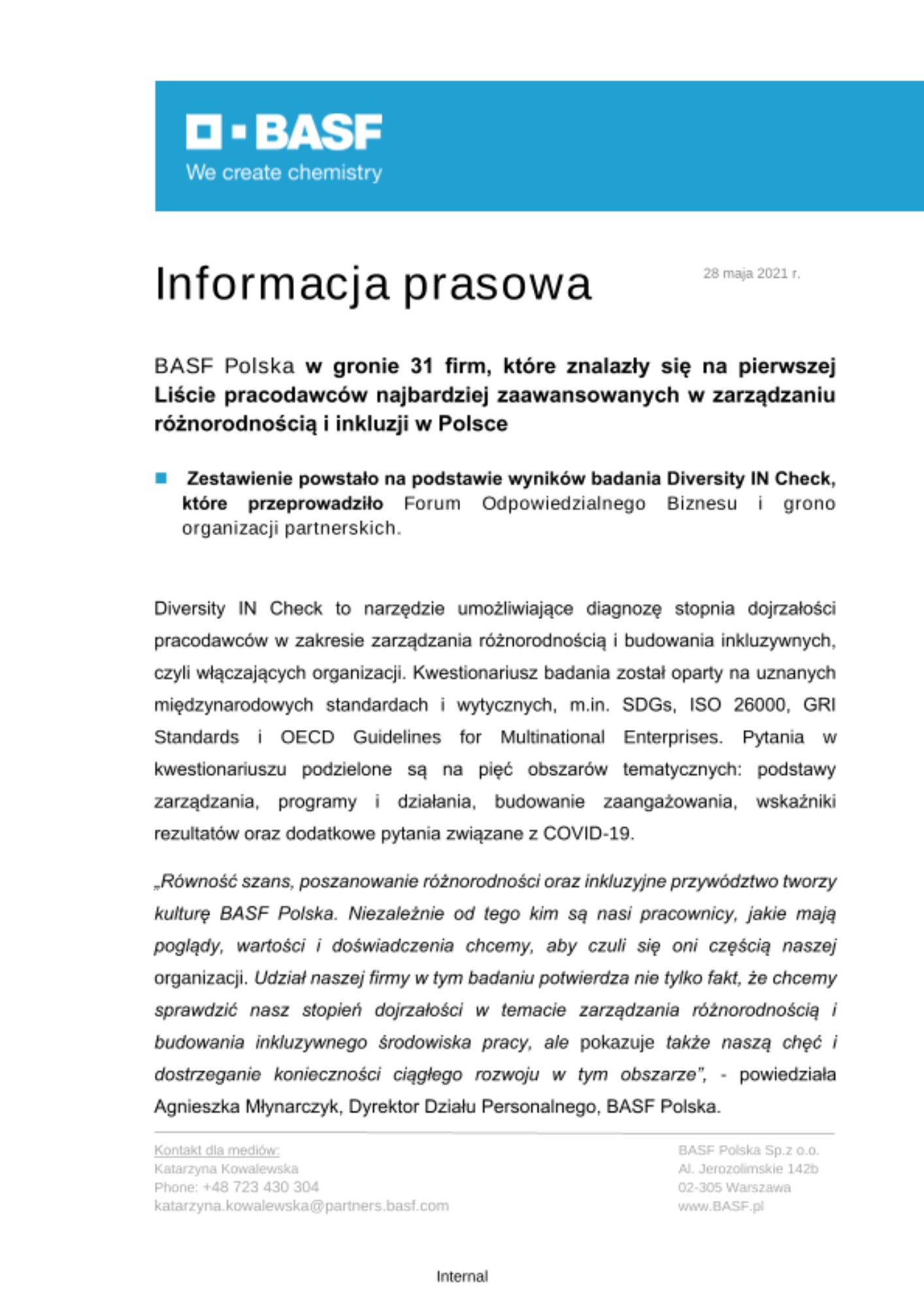„Równość szans, poszanowanie różnorodności oraz inkluzyjne przywództwo tworzy kulturę BASF Polska. Niezależnie od tego kim są nasi pracownicy, jakie mają poglądy, wartości i doświadczenia chcemy, aby czuli się oni częścią naszej organizacji. Udział naszej firmy w tym badaniu potwierdza nie tylko fakt, że chcemy sprawdzić nasz stopień dojrzałości w temacie zarządzania różnorodnością i budowania inkluzywnego środowiska pracy, ale pokazuje także naszą chęć i dostrzeganie konieczności ciągłego rozwoju w tym obszarze”, - powiedziała Agnieszka Młynarczyk, Dyrektor Działu Personalnego, BASF Polska.