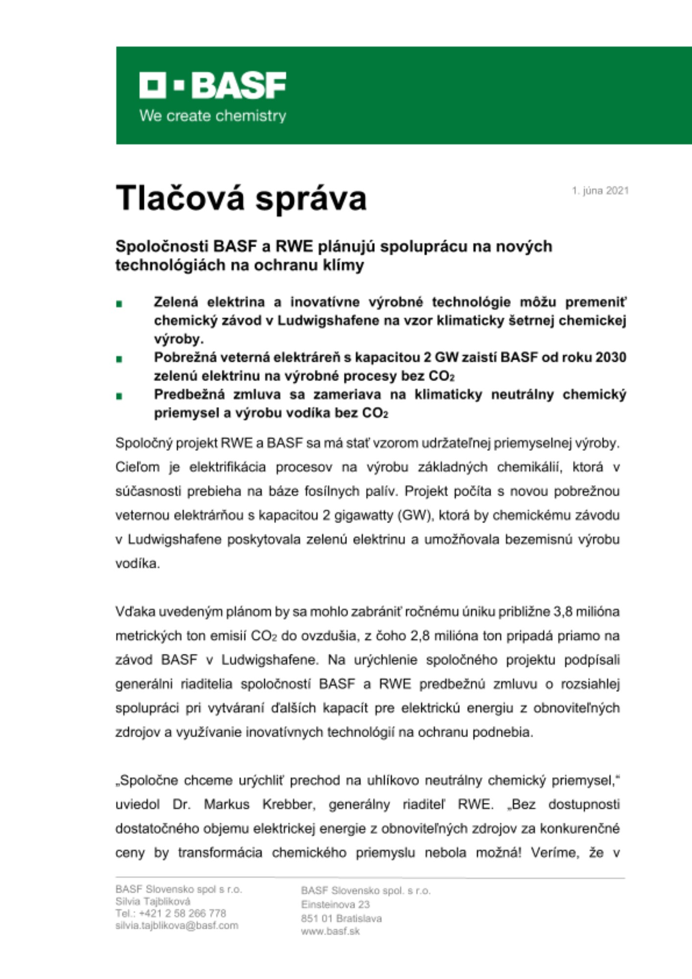„Spoločne chceme urýchliť prechod na uhlíkovo neutrálny chemický priemysel,“ uviedol Dr. Markus Krebber, generálny riaditeľ RWE. „Bez dostupnosti dostatočného objemu elektrickej energie z obnoviteľných zdrojov za konkurenčné ceny by transformácia chemického priemyslu nebola možná! Veríme, že v spolupráci s RWE ako poprednou spoločnosťou v oblasti výroby energie sa nám to podarí,“ doplnil Dr. Martin Brudermüller, predseda predstavenstva BASF SE.