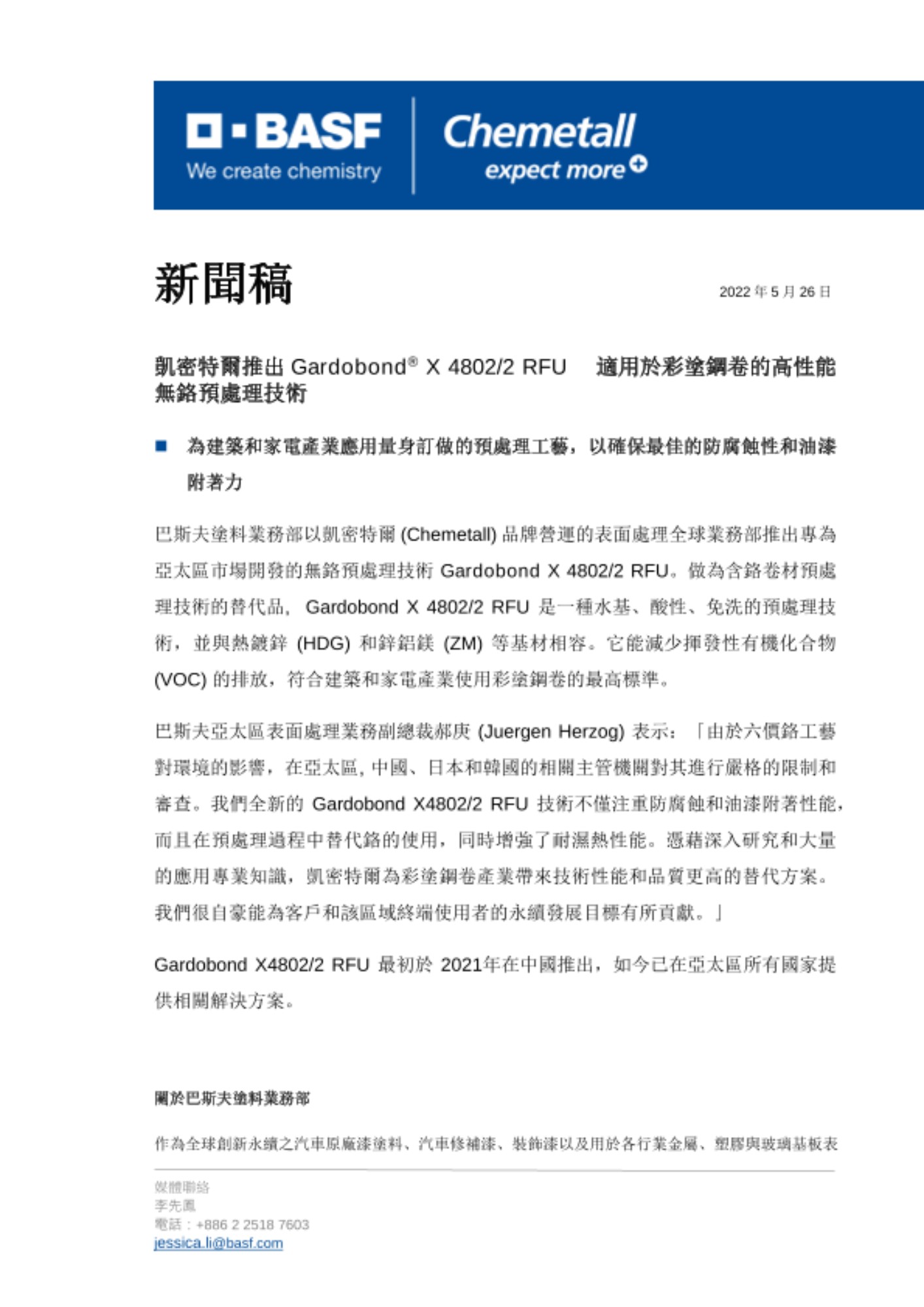 巴斯夫塗料業務部以凱密特爾 (Chemetall) 品牌營運的表面處理全球業務部推出專為亞太區市場開發的無鉻預處理技術 Gardobond X 4802/2 RFU。做為含鉻卷材預處理技術的替代品, Gardobond X 4802/2 RFU 是一種水基、酸性、免洗的預處理技術,並與熱鍍鋅 (HDG) 和鋅鋁鎂 (ZM) 等基材相容。它能減少揮發性有機化合物 (VOC) 的排放,符合建築和家電產業使用彩塗鋼卷的最高標準。