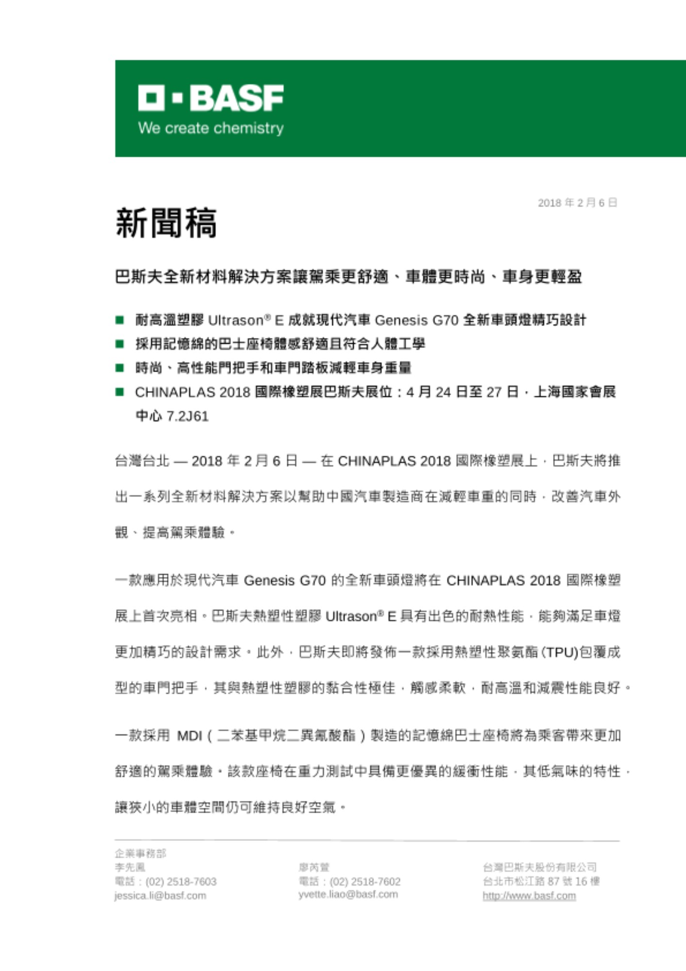 台灣台北 — 2018 年 2月 6 日 — 在 CHINAPLAS 2018 國際橡塑展上,巴斯夫將推出一系列全新材料解決方案以幫助中國汽車製造商在減輕車重的同時,改善汽車外觀、提高駕乘體驗。
