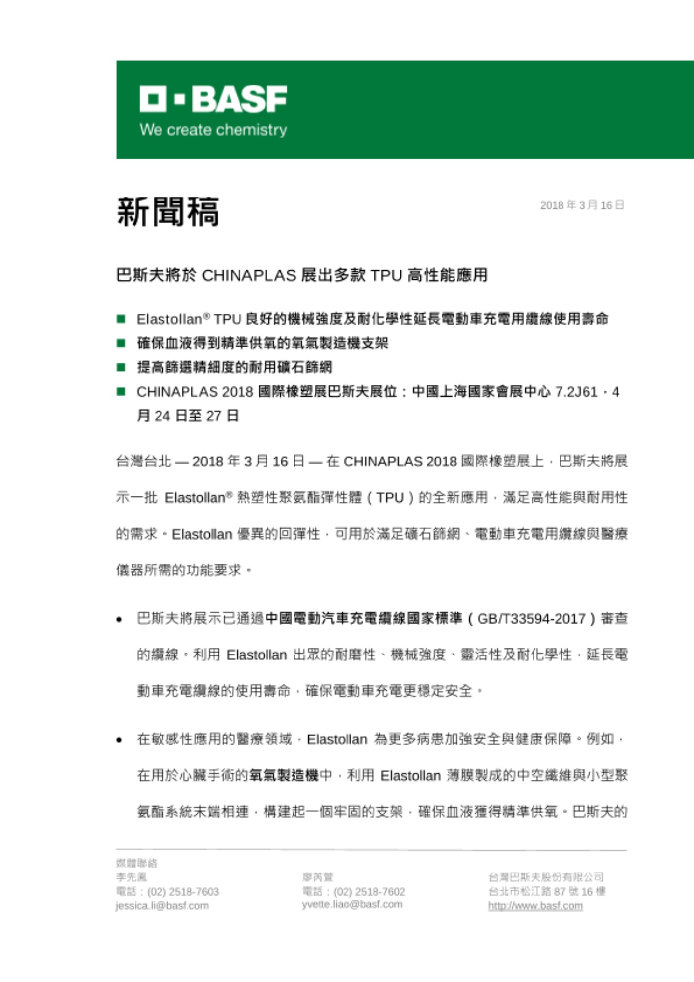 - CHINAPLAS 2018 國際橡塑展巴斯夫展位:中國上海國家會展中心 7.2J61,4 月 24 日至 27 日