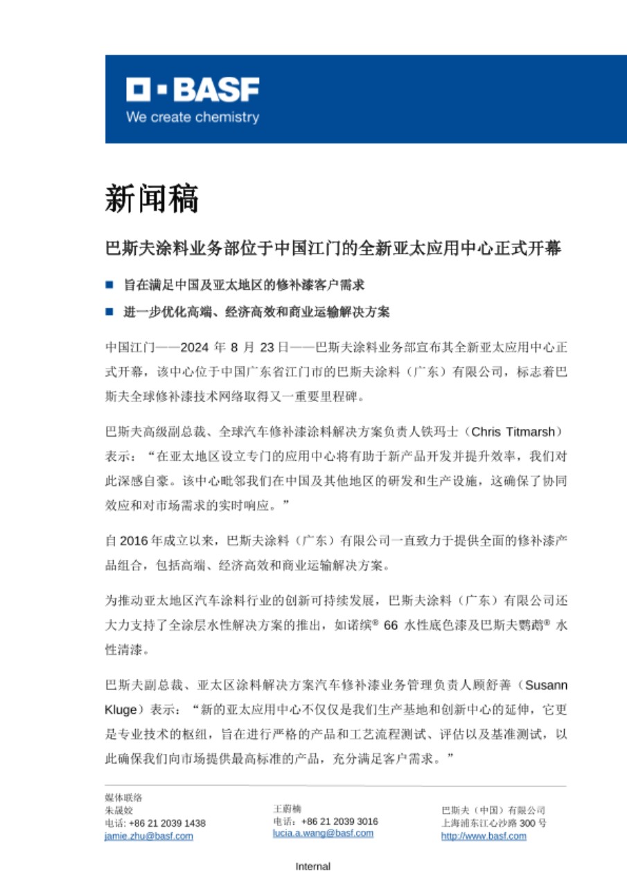 巴斯夫資深副總裁、全球汽車修補漆塗料解決方案負責人鐵瑪士 (Chris Titmarsh) 表示:「在亞太區設立專門的應用中心將有助於新產品開發並提升效率,我們對此深感自豪。該中心毗鄰我們在中國及其他地區的研發和生產設施,這確保了綜效和對市場需求的即時回應。」