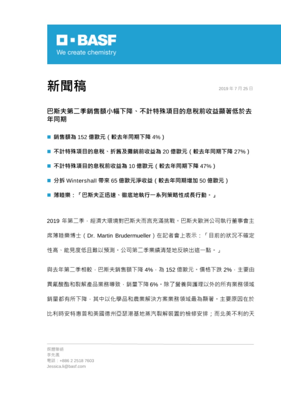 2019年第二季,經濟大環境對巴斯夫而言充滿挑戰。巴斯夫歐洲公司執行董事會主席薄睦樂博士(Dr. Martin Brudermueller)在記者會上表示:「目前的狀況不確定性高、能見度低且難以預測。公司第二季業績清楚地反映出這一點。」