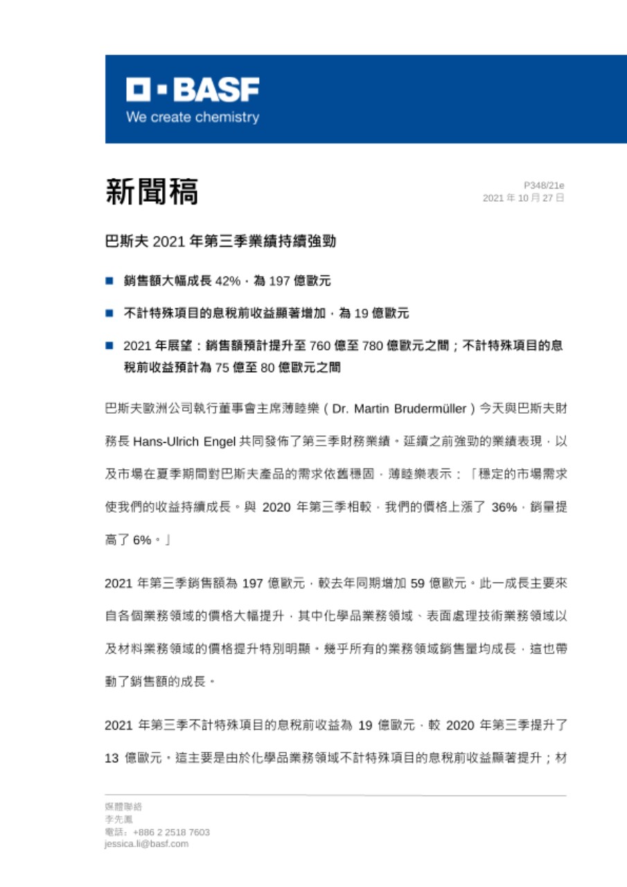 巴斯夫歐洲公司執行董事會主席薄睦樂(Dr. Martin Brudermüller)今天與巴斯夫財務長 Hans-Ulrich Engel 共同發佈了第三季財務業績。延續之前強勁的業績表現,以及市場在夏季期間對巴斯夫產品的需求依舊穩固,薄睦樂表示:「穩定的市場需求使我們的收益持續成長。與2020年第三季相較,我們的價格上漲了36%,銷量提高了6%。」