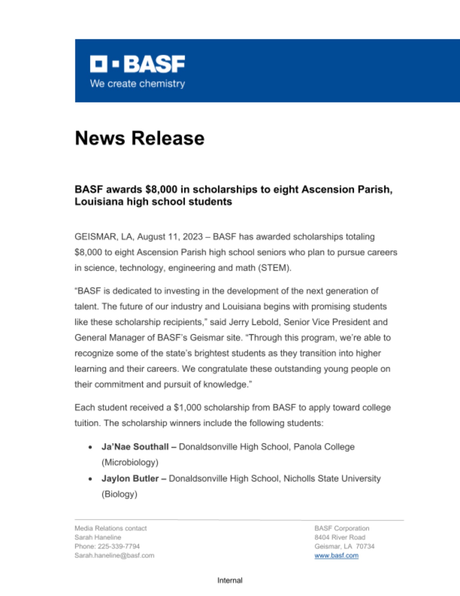 “BASF is dedicated to investing in the development of the next generation of talent. The future of our industry and Louisiana begins with promising students like these scholarship recipients,” said Jerry Lebold, Senior Vice President and General Manager of BASF’s Geismar site. “Through this program, we’re able to recognize some of the state’s brightest students as they transition into higher learning and their careers. We congratulate these outstanding young people on their commitment and pursuit of knowledge.”