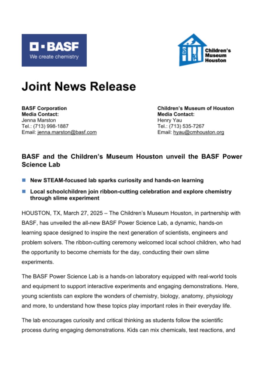 HOUSTON, TX, March 27, 2025 – The Children’s Museum Houston, in partnership with BASF, has unveiled the all-new BASF Power Science Lab, a dynamic, hands-on learning space designed to inspire the next generation of scientists, engineers and problem solvers. The ribbon-cutting ceremony welcomed local school children, who had the opportunity to become chemists for the day, conducting their own slime experiments.