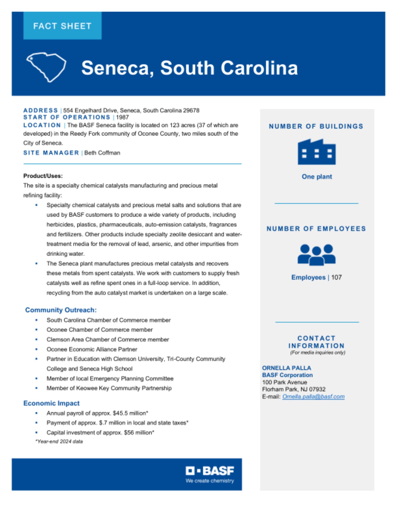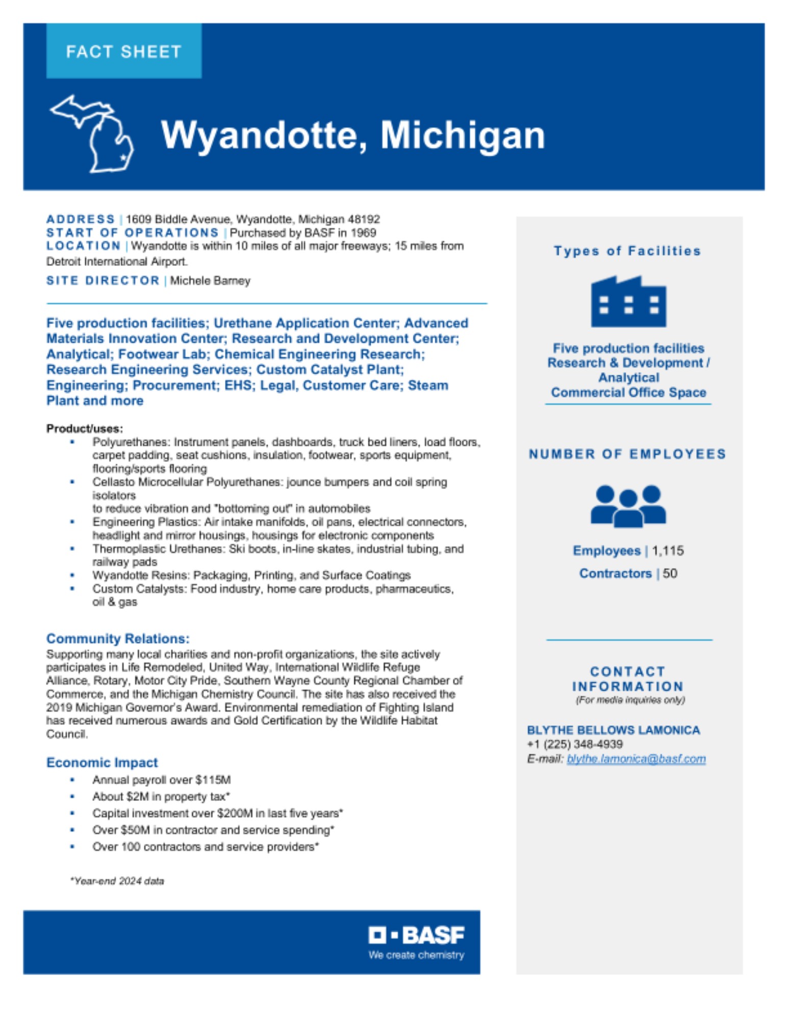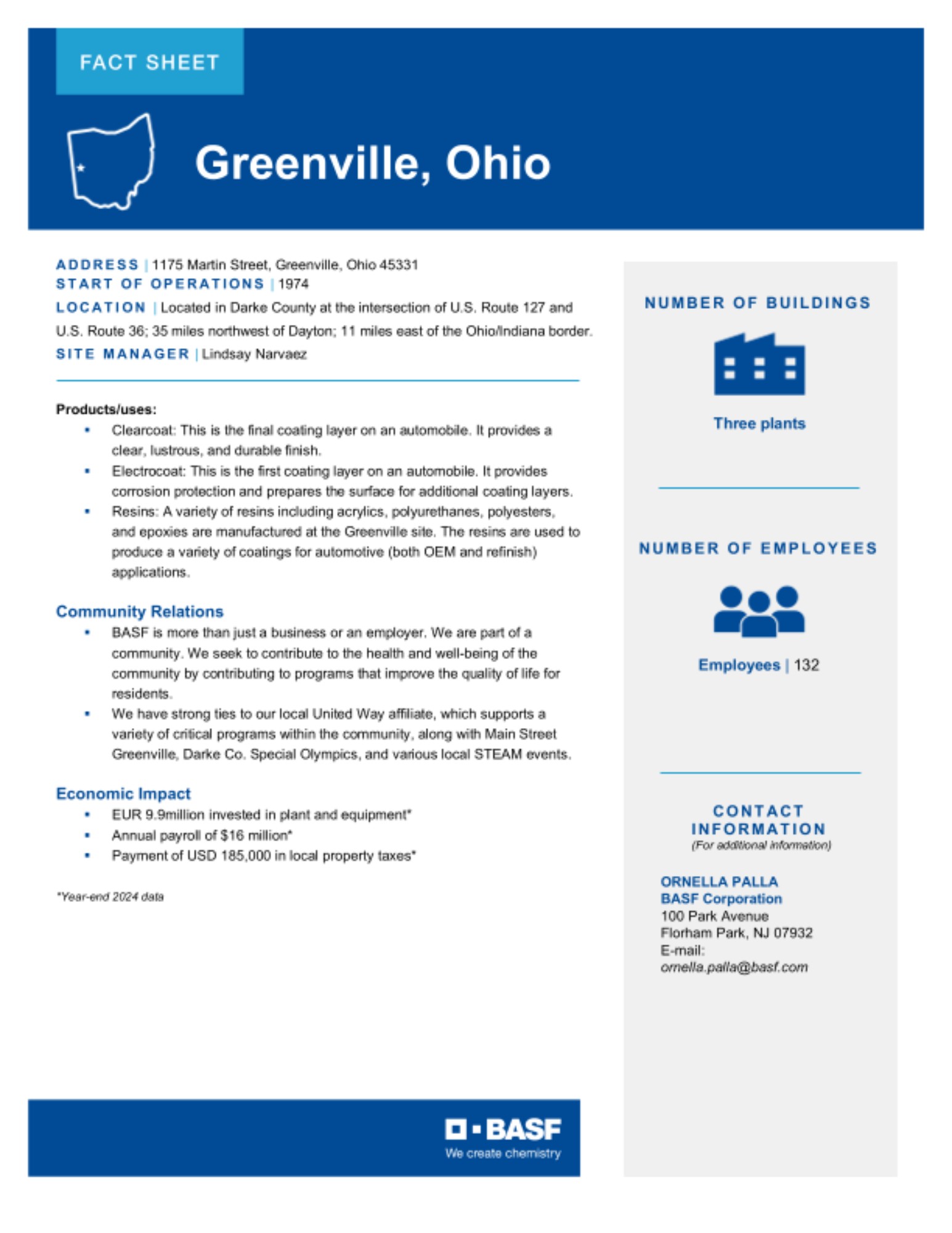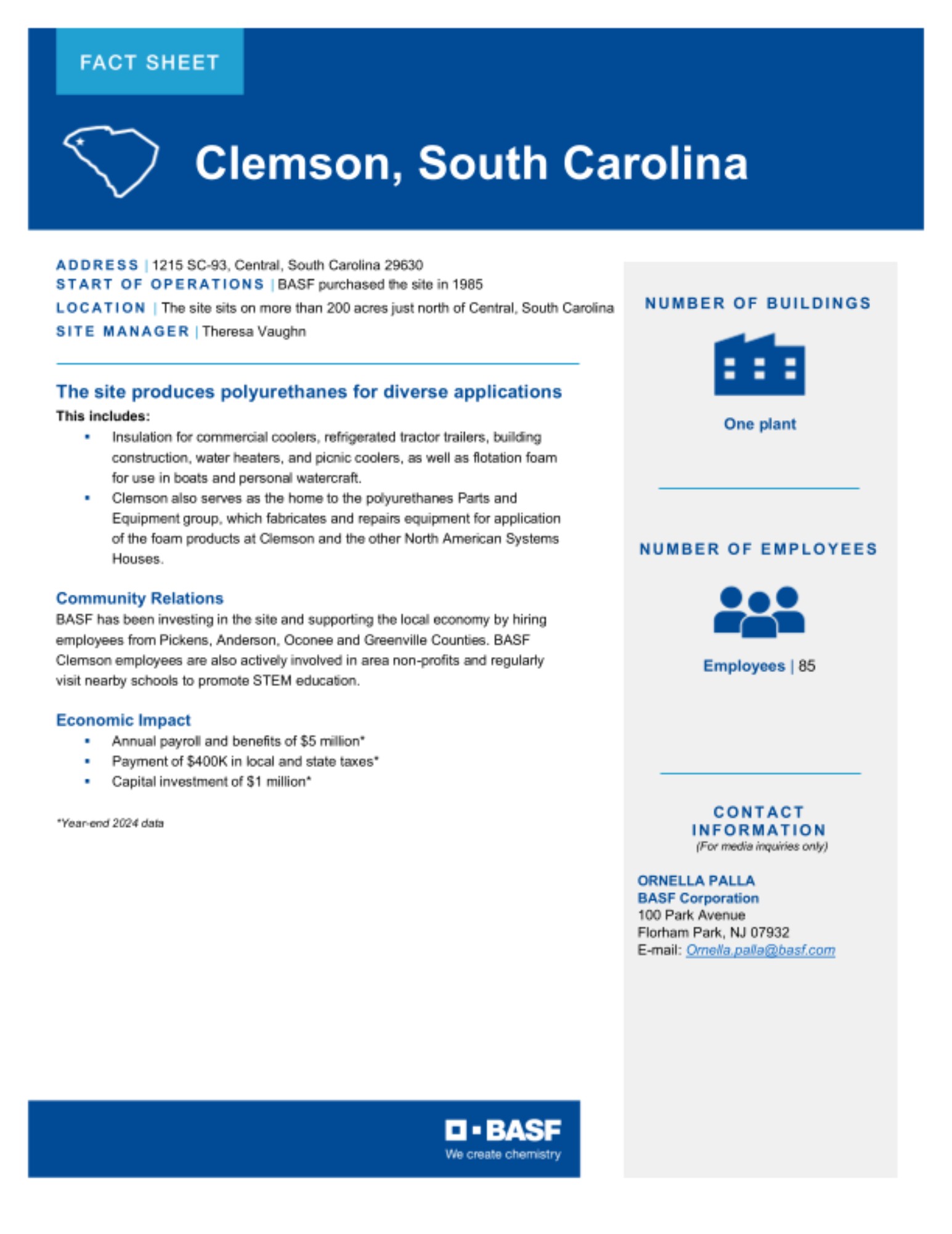 The Site Fact Sheets below provide overviews of BASF's key manufacturing sites in the U.S., including what is manufactured at each site and the site's local economic impact.