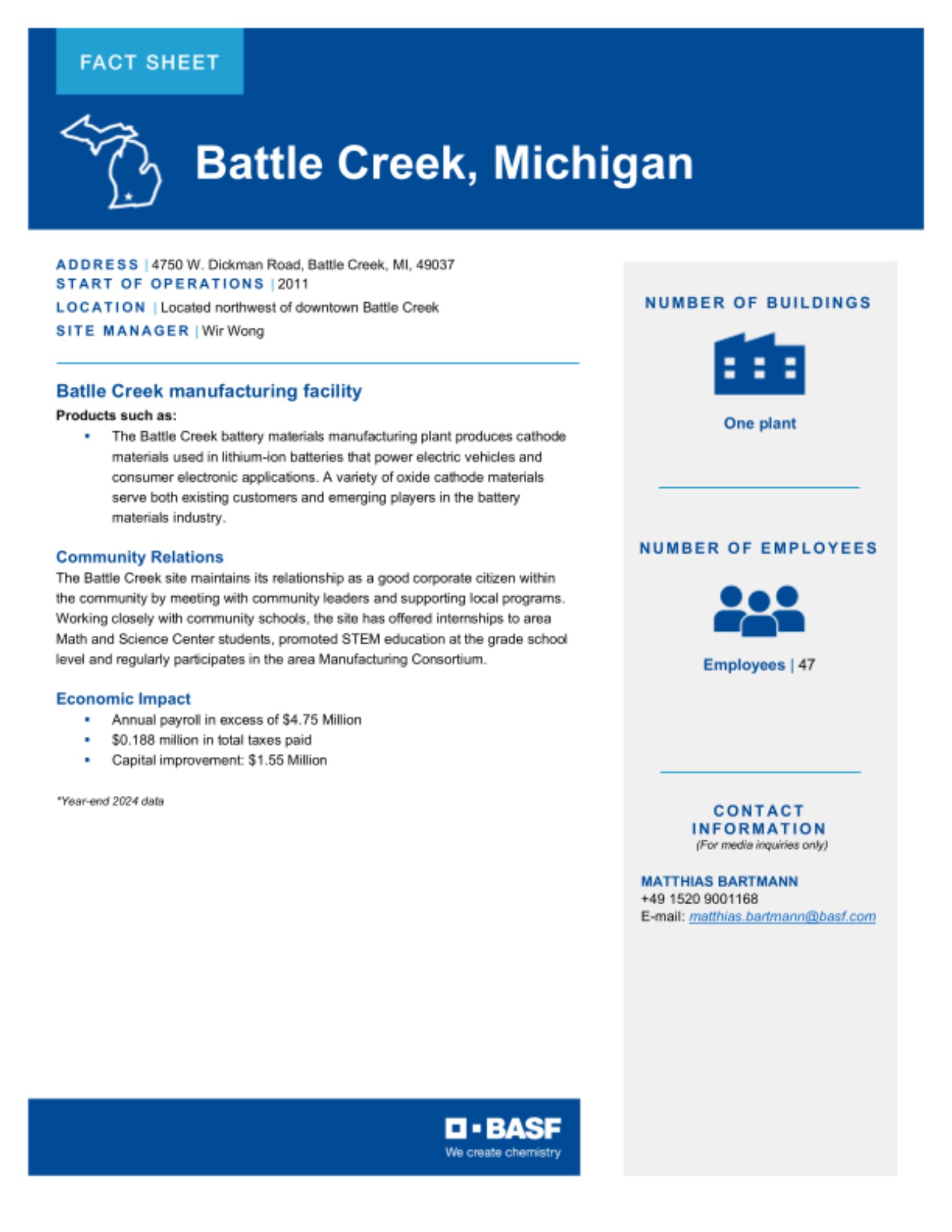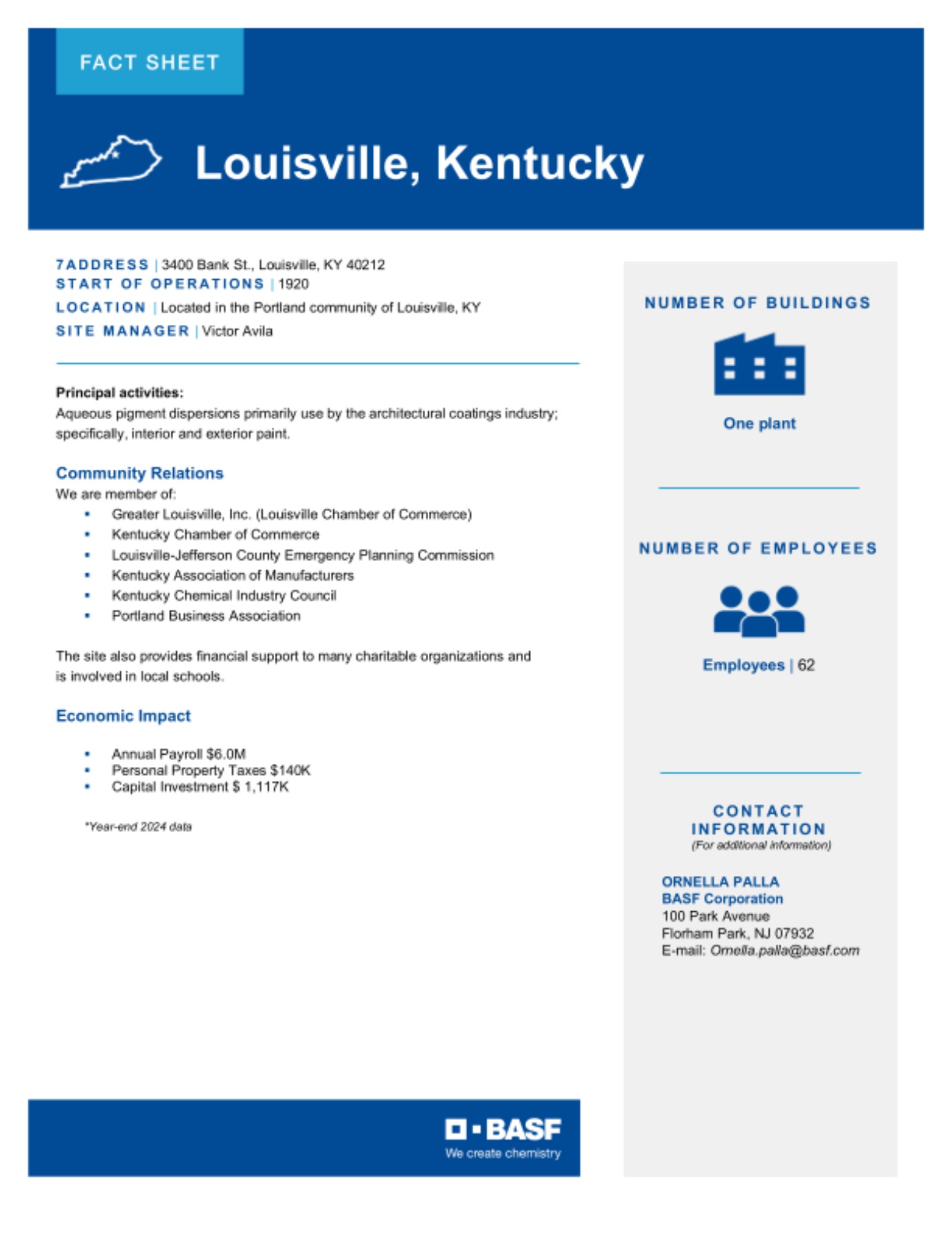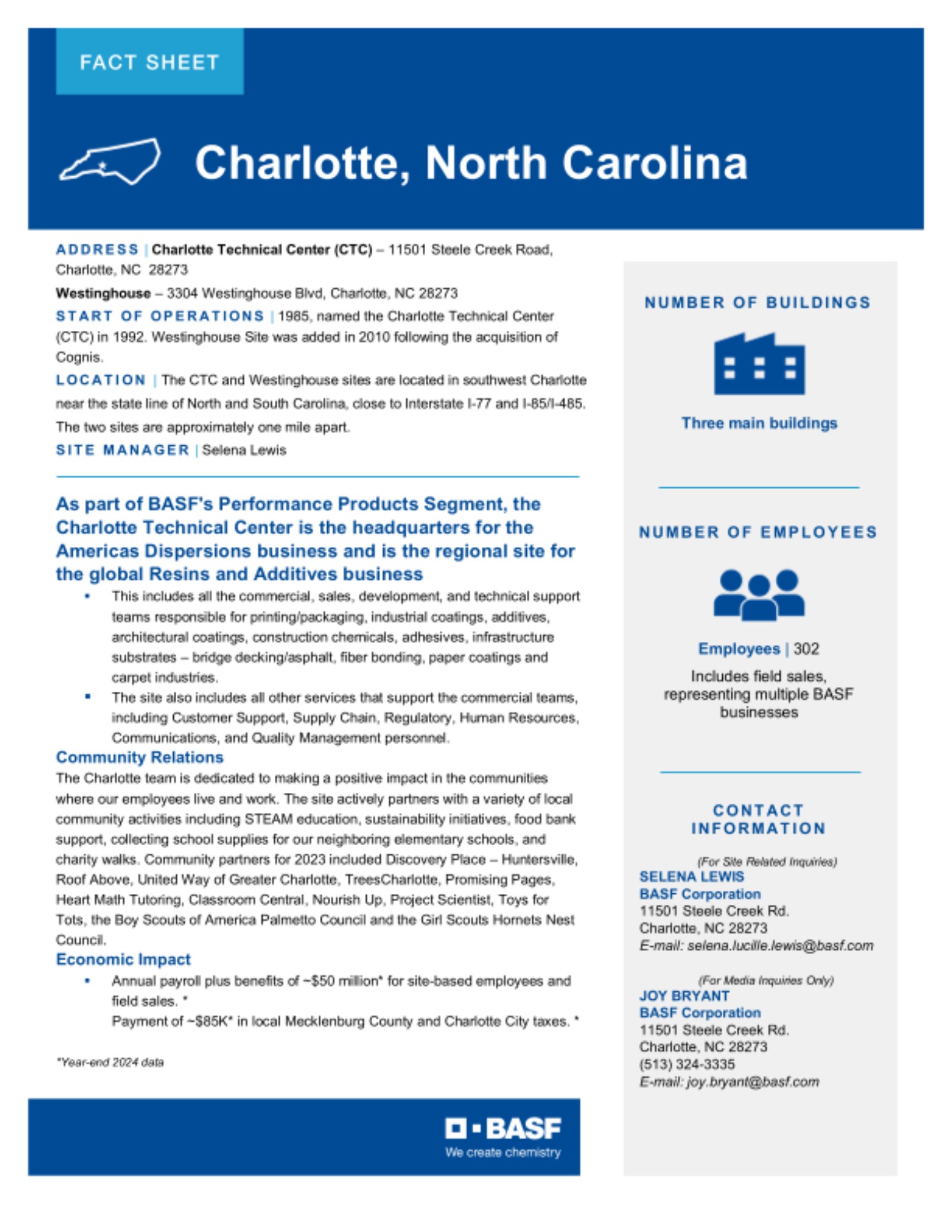 The Site Fact Sheets below provide overviews of BASF's key manufacturing sites in the U.S., including what is manufactured at each site and the site's local economic impact.