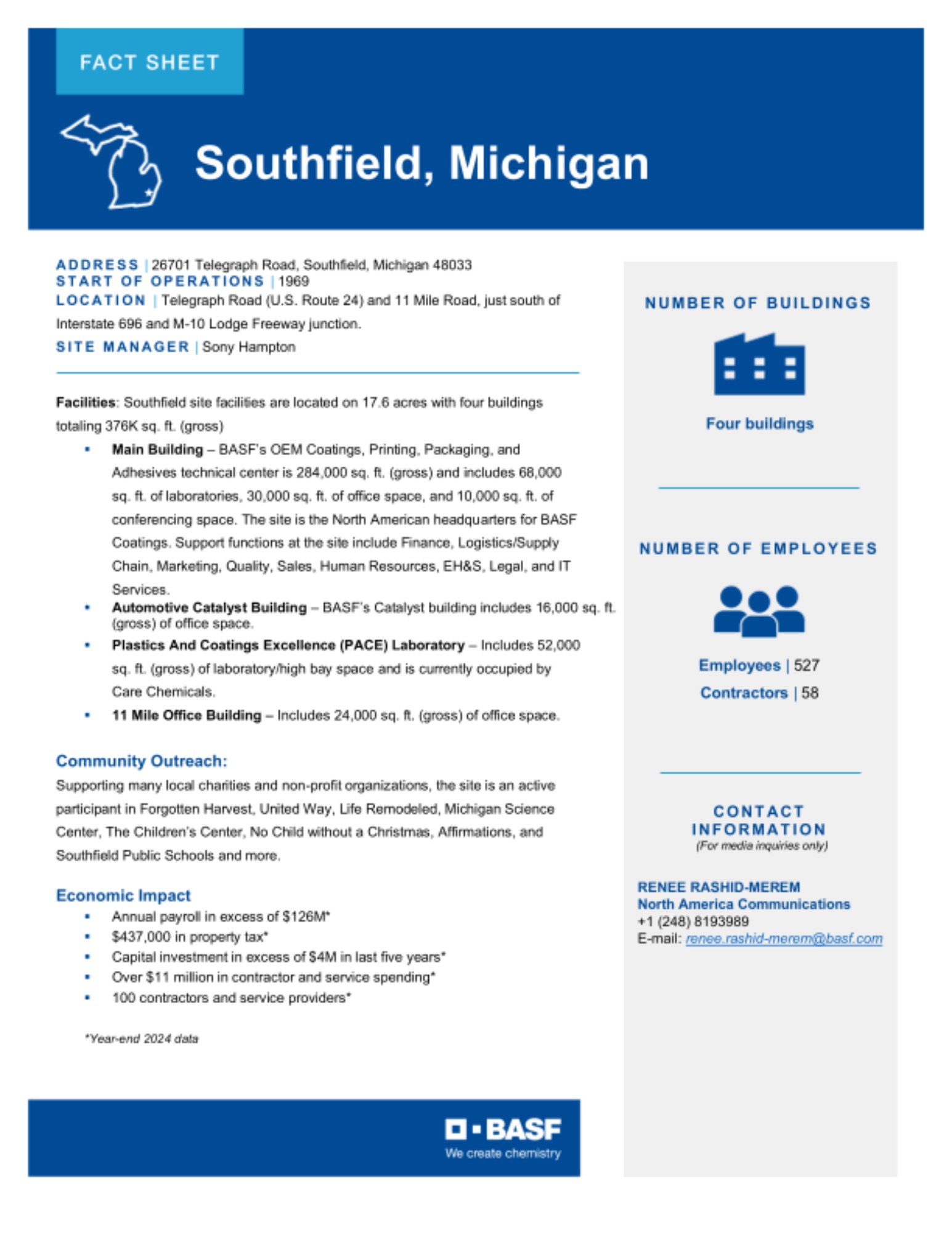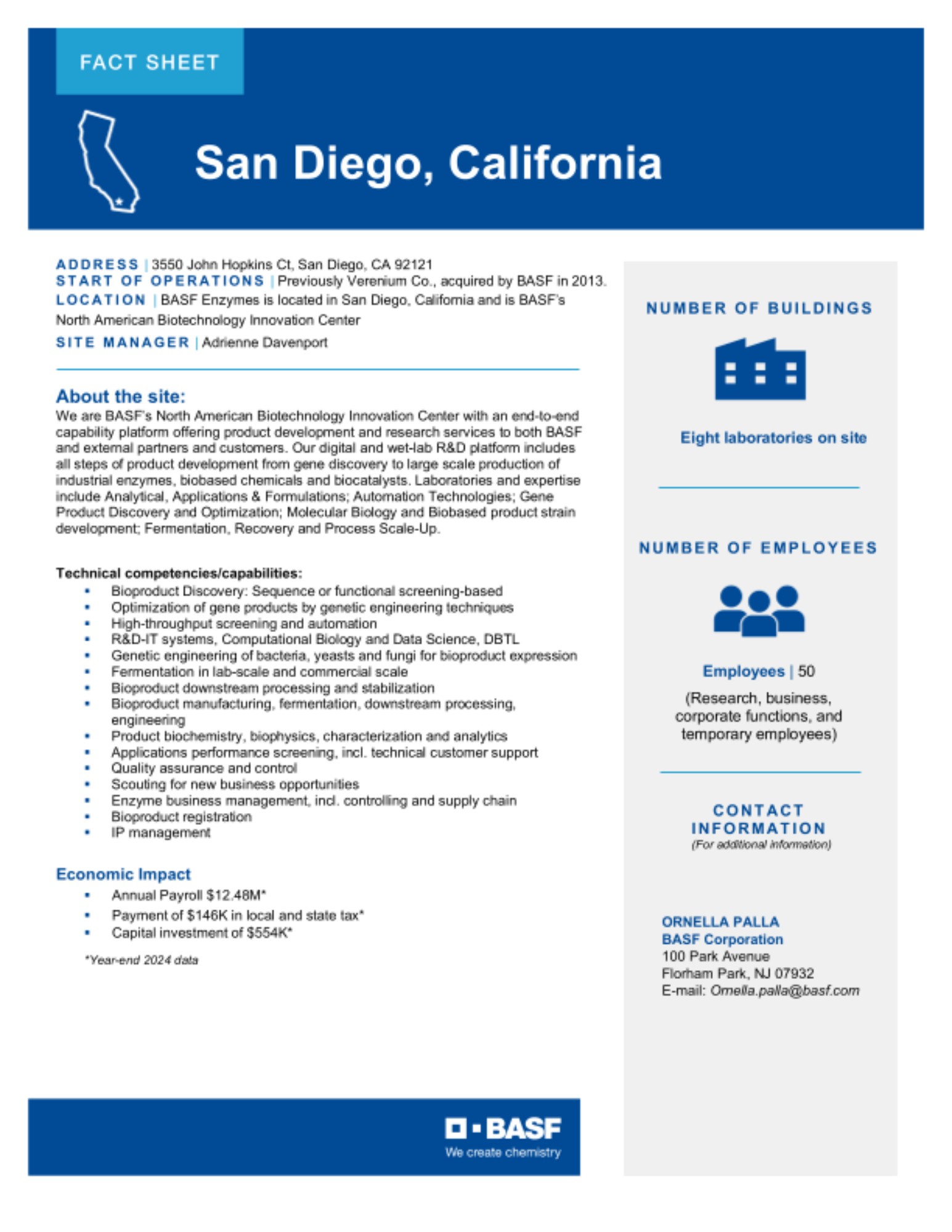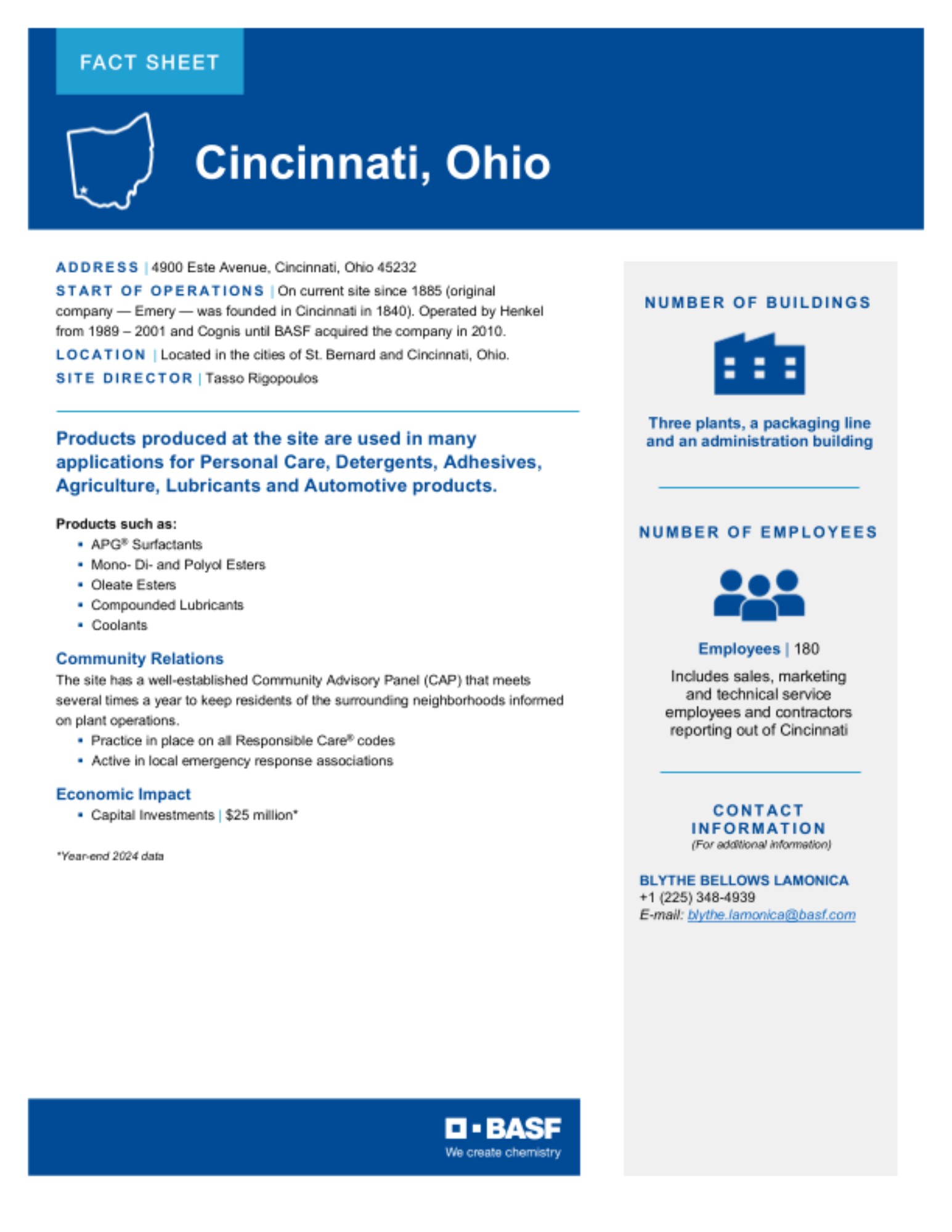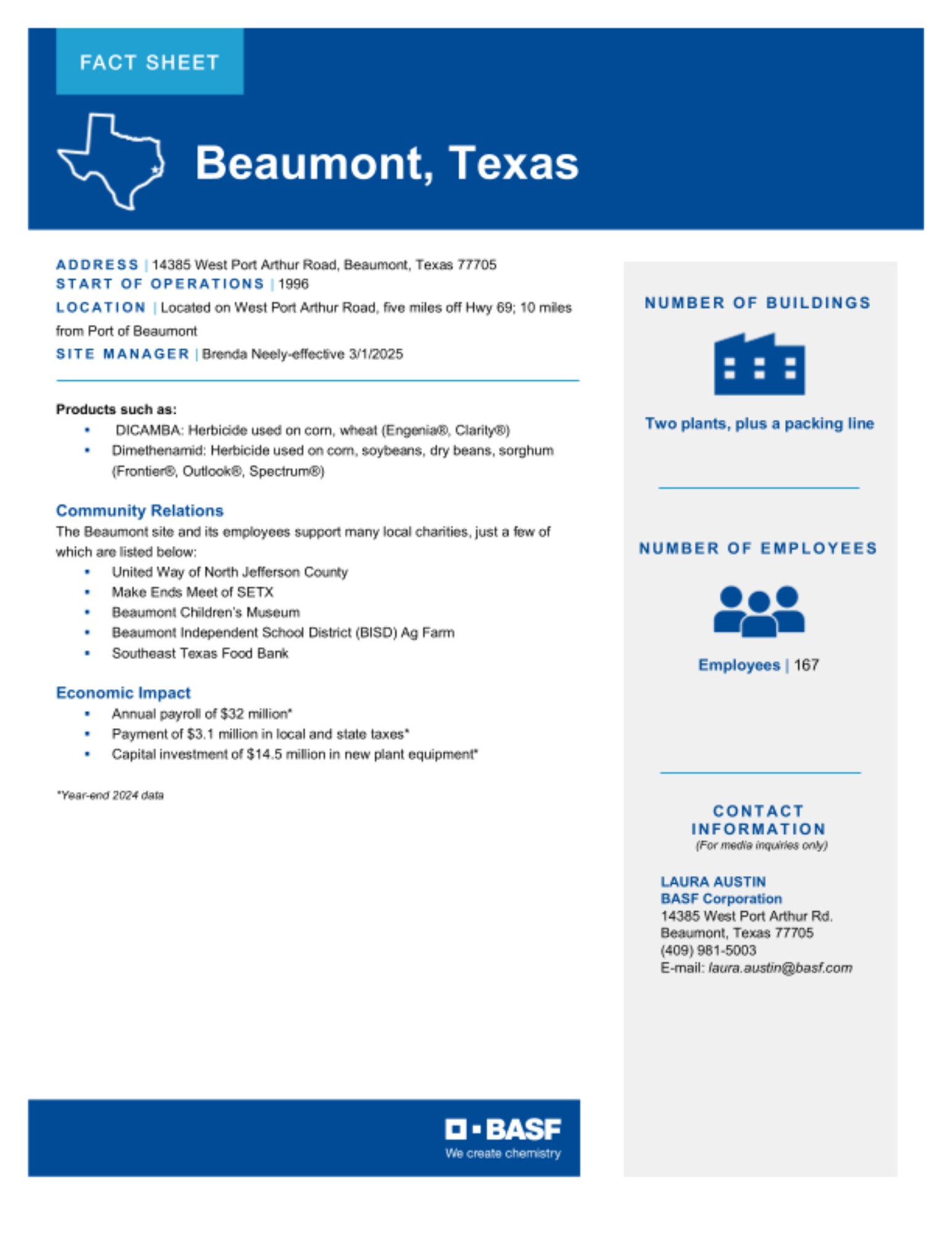 The Site Fact Sheets below provide overviews of BASF's key manufacturing sites in the U.S., including what is manufactured at each site and the site's local economic impact.