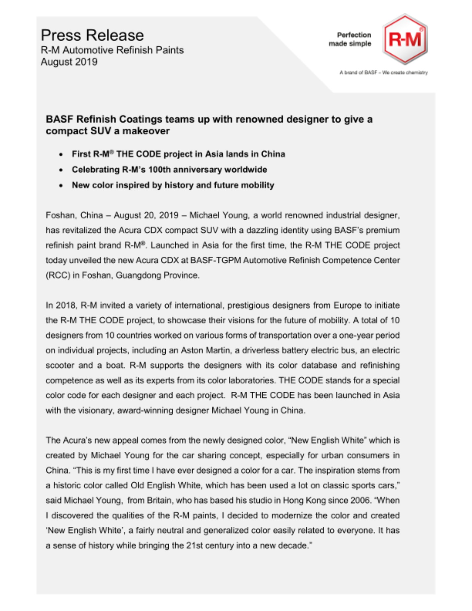 “R-M THE CODE helps showcase the future of mobility in colors and design. We underpin R-M’s position as a leading innovative premium brand in the Asian refinish market, which provides our customers with creativity and flexibility in the next generation of colors and design,” said Chris Titmarsh, Vice President, Automotive Refinish Coatings, Asia Pacific, BASF. “With R-M paint, we are motivating designers and engineers to create the concepts of the future through experimental design and challenging R-M’s full potential in innovation. Michael Young’s expertise and skills clearly showcased this and as a result, a new color was born, giving the Acura CDX SUV a new identity.”