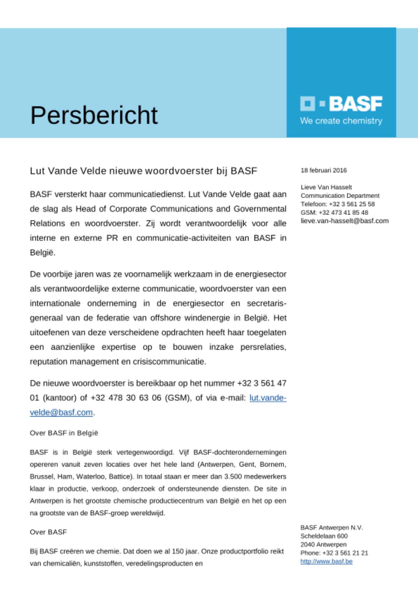 De nieuwe woordvoerster is bereikbaar op het nummer +32 3 561 47 01 (kantoor) of +32 478 30 63 06 (GSM), of via e-mail: lut.vande-velde@basf.com.
