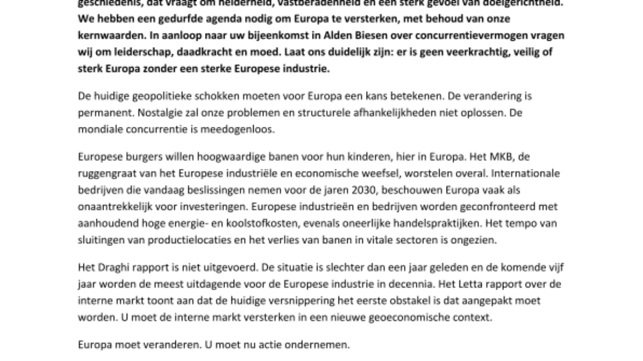 Tijdens de summit riepen 25 industriële sectoren opnieuw op tot dringende en gedurfde maatregelen om het concurrentievermogen van Europa te versterken. Daarbij werd onderstreept dat de analyse bekend is en de intenties zijn uitgesproken — maar dat nu concrete uitvoering nodig is.
