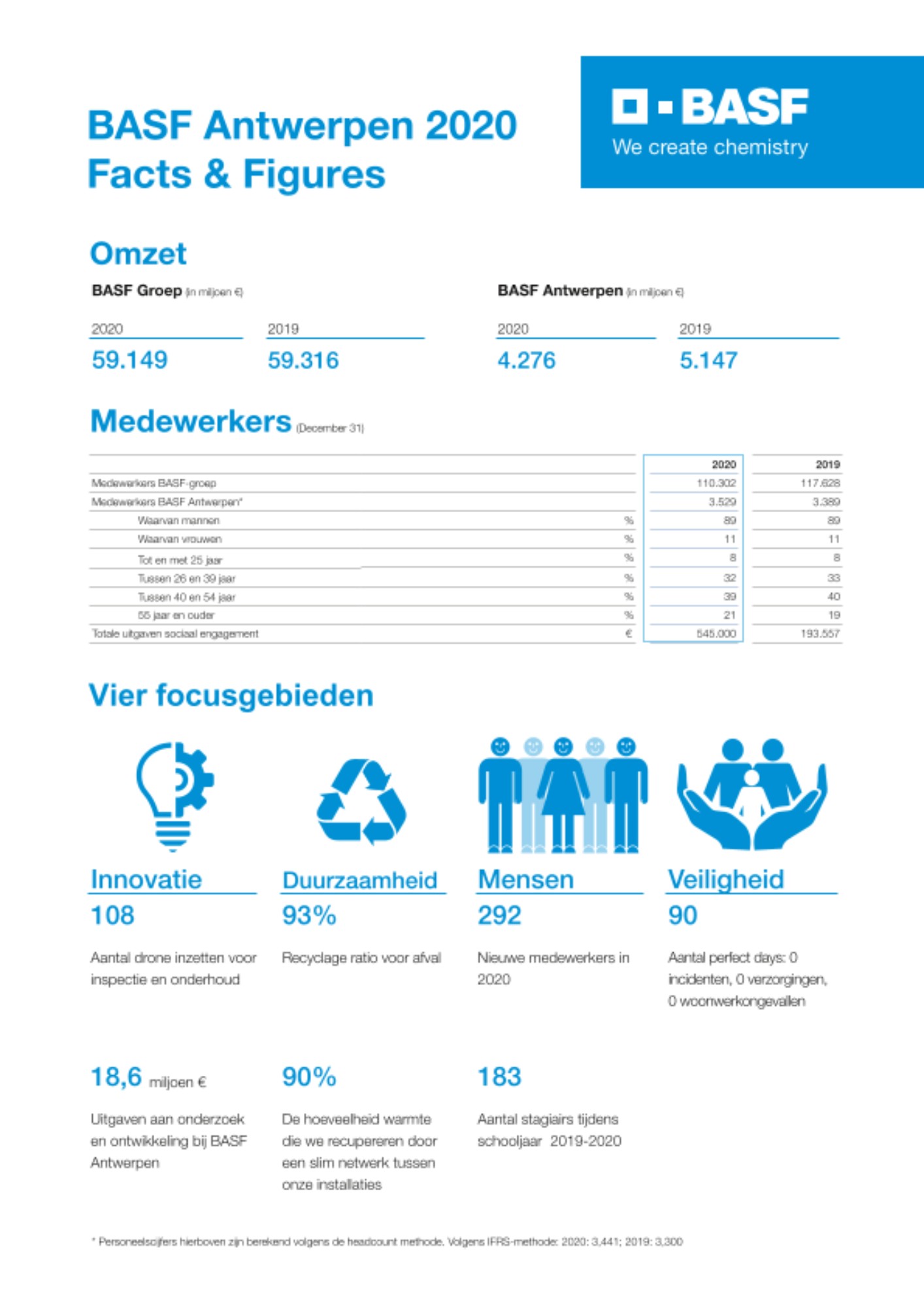 2020 was een jaar getekend door het coronavirus. Hier volgt een overzicht van de relevantste cijfers van 2020 zoals omzet, medewerkers, duurzaamheid en veiligheid op BASF Antwerpen.