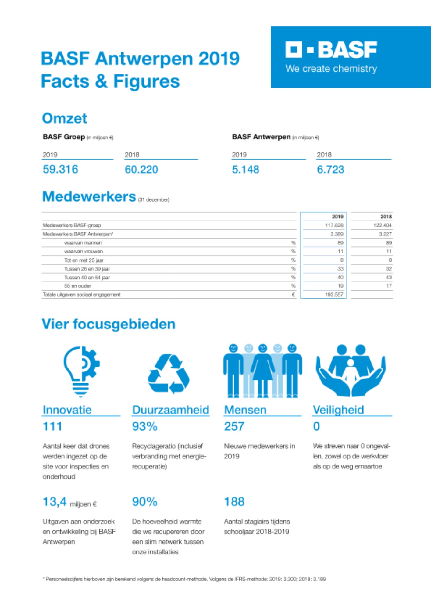 Antwerpen - 25 mei 2020 | Hier vind je een overzicht van relevante cijfers van het voorbije jaar over omzet, innovatie, medewerkers, milieu en veiligheid van BASF Antwerpen.