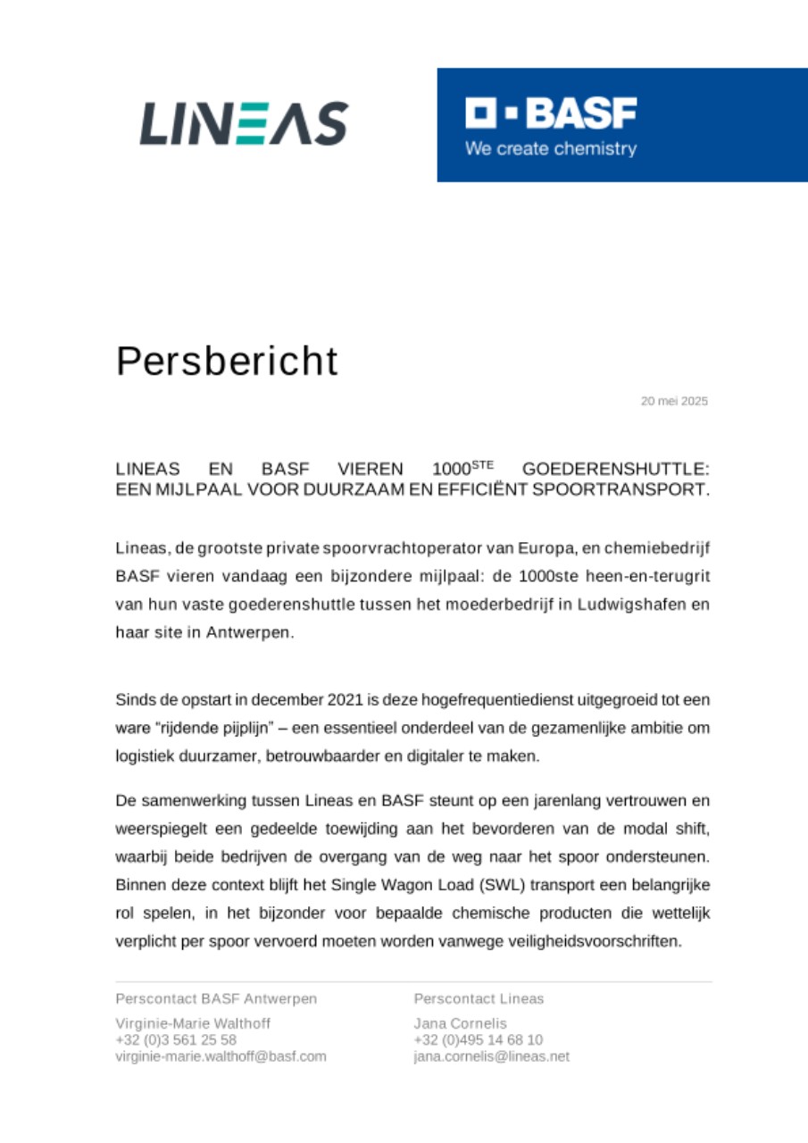 Lineas, de grootste private spoorvrachtoperator van Europa, en chemiebedrijf BASF vieren vandaag een bijzondere mijlpaal: de 1000ste heen-en-terugrit van hun vaste goederenshuttle tussen het moederbedrijf in Ludwigshafen en haar site in Antwerpen.
