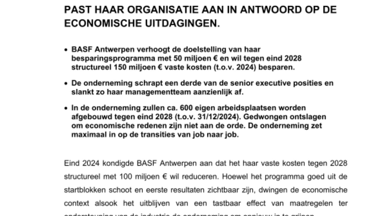 - BASF Antwerpen verhoogt de doelstelling van haar besparingsprogramma met 50 miljoen € en wil tegen eind 2028 structureel 150 miljoen € vaste kosten (t.o.v. 2024) besparen.