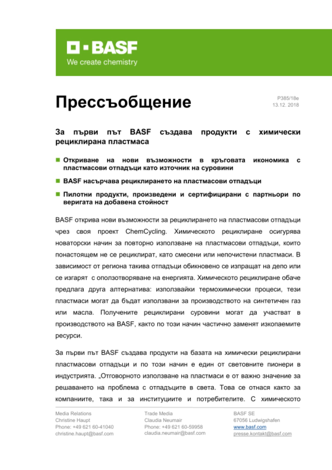 За първи път BASF създава продукти на базата на химически рециклирани пластмасови отпадъци и по този начин е един от световните пионери в индустрията. „Отговорното използване на пластмаси е от важно значение за решаването на проблема с отпадъците в света. Това се отнася както за компаниите, така и за институциите и потребителите. С химическото рециклиране искаме да направим значителен принос, за да намалим количеството на пластмасови отпадъци – каза д-р Мартин Брудермюлер, председател на Съвета на изпълнителните директори и главен технологичен директор на BASF SE. – Чрез нашия проект ChemCycling ние използваме пластмасови отпадъци като ресурс. По този начин ние създаваме стойност за околната среда, обществото и икономиката. Обединихме усилията си с партньори по цялата верига на добавена стойност, за да създадем работещ модел на кръгова икономика”. BASF си сътрудничи тясно със своите клиенти и партньори – от компании за управление на отпадъците до доставчици на технологии и производители на опаковки, за да изгради кръгова верига на добавена стойност.