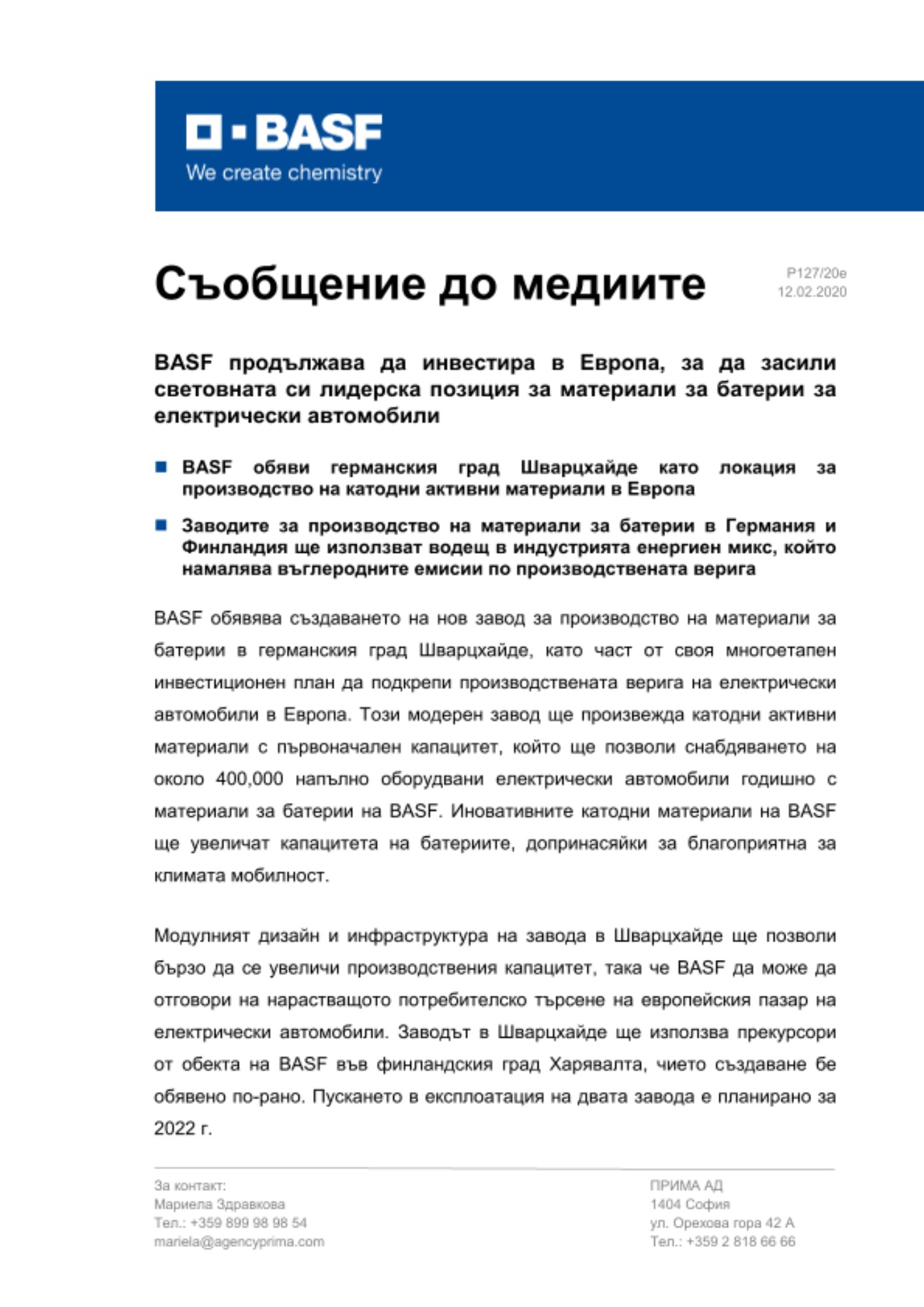 BASF обявява създаването на нов завод за производство на материали за батерии в германския град Шварцхайде, като част от своя многоетапен инвестиционен план да подкрепи производствената верига на електрически автомобили в Европа. Този модерен завод ще произвежда катодни активни материали с първоначален капацитет, който ще позволи снабдяването на около 400,000 напълно оборудвани електрически автомобили годишно с материали за батерии на BASF. Иновативните катодни материали на BASF ще увеличат капацитета на батериите, допринасяйки за благоприятна за климата мобилност.