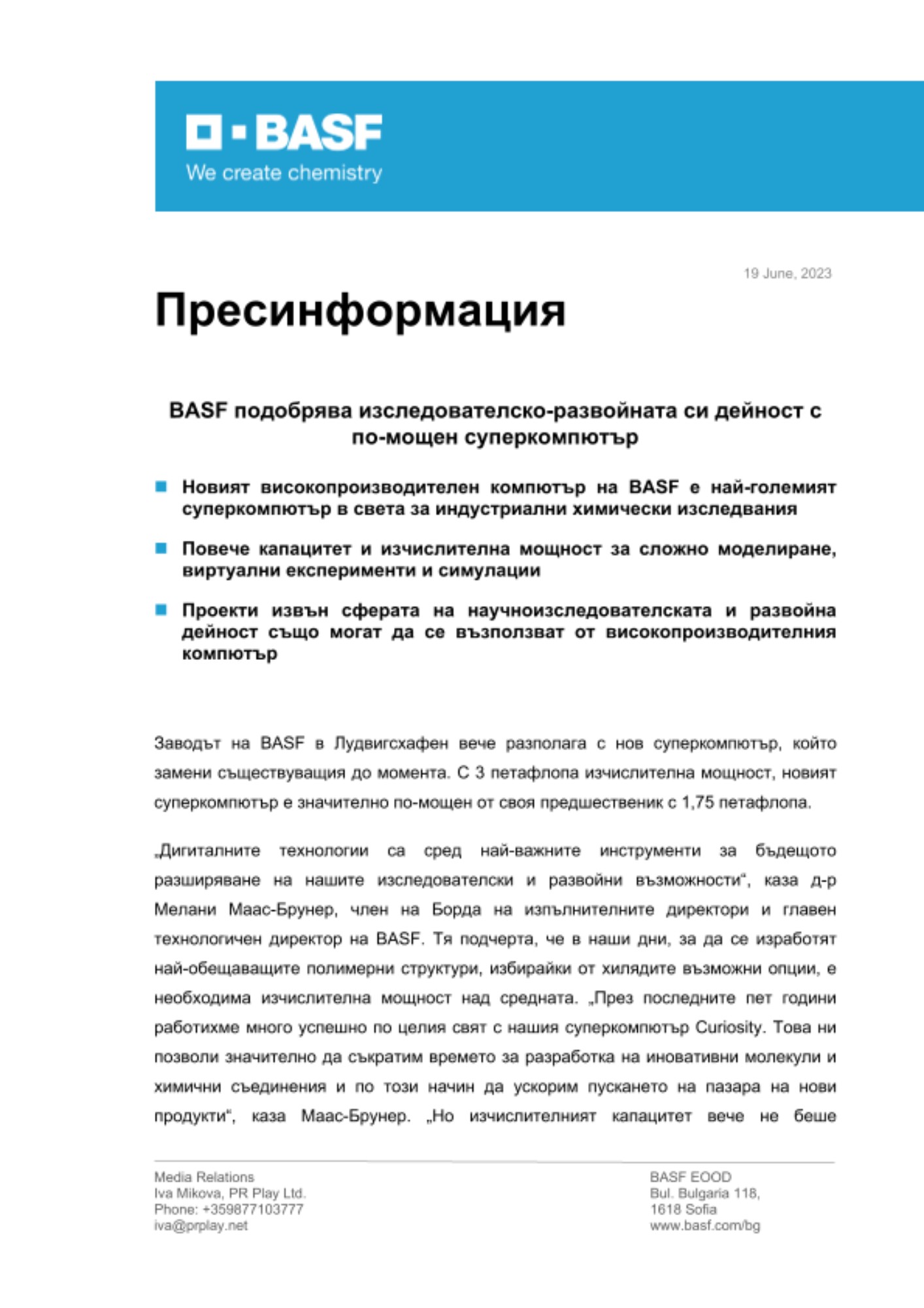 „Дигиталните технологии са сред най-важните инструменти за бъдещото разширяване на нашите изследователски и развойни възможности“, каза д-р Мелани Маас-Брунер, член на Борда на изпълнителните директори и главен технологичен директор на BASF. Тя подчерта, че в наши дни, за да се изработят най-обещаващите полимерни структури, избирайки от хилядите възможни опции, е необходима изчислителна мощност над средната. „През последните пет години работихме много успешно по целия свят с нашия суперкомпютър Curiosity. Това ни позволи значително да съкратим времето за разработка на иновативни молекули и химични съединения и по този начин да ускорим пускането на пазара на нови продукти“, каза Маас-Брунер. „Но изчислителният капацитет вече не беше достатъчен. Освен това сложността на нашите изследователски проекти и съответно изискванията към суперкомпютъра се увеличиха. Затова решихме да инвестираме в нов високопроизводителен компютър.“