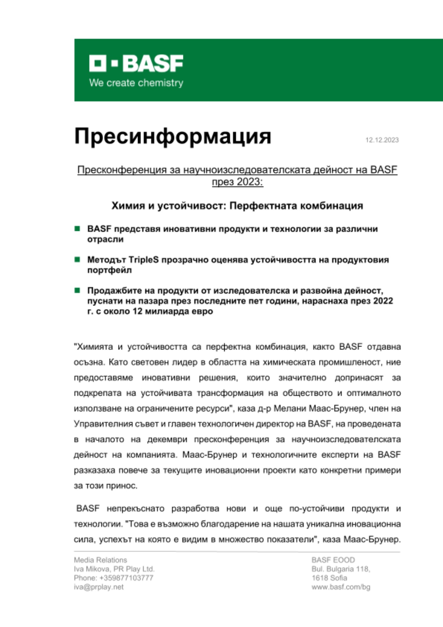"Химията и устойчивостта са перфектна комбинация, както BASF отдавна осъзна. Като световен лидер в областта на химическата промишленост, ние предоставяме иновативни решения, които значително допринасят за подкрепата на устойчивата трансформация на обществото и оптималното използване на ограничените ресурси", каза д-р Мелани Маас-Брунер, член на Управителния съвет и главен технологичен директор на BASF, на проведената в началото на декември пресконференция за научноизследователската дейност на компанията. Маас-Брунер и технологичните експерти на BASF разказаха повече за текущите иновационни проекти като конкретни примери за този принос.