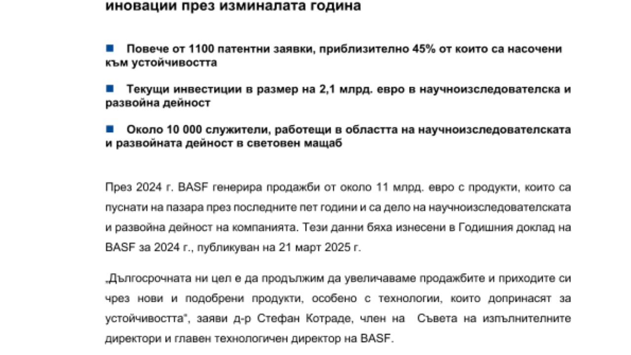 BASF генерира приблизително 11 милиарда евро приходи от иновации през изминалата година
