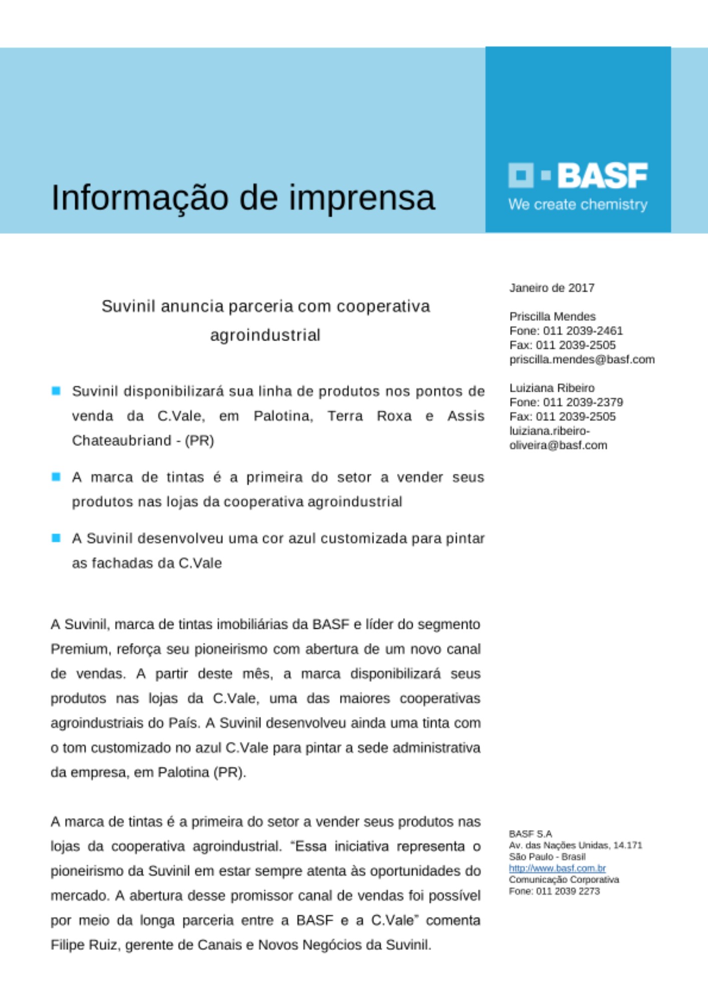 A Suvinil, marca de tintas imobiliárias da BASF e líder do segmento Premium, reforça seu pioneirismo com abertura de um novo canal de vendas. A partir deste mês, a marca disponibilizará seus produtos nas lojas da C.Vale, uma das maiores cooperativas agroindustriais do País. A Suvinil desenvolveu ainda uma tinta com o tom customizado no azul C.Vale para pintar a sede administrativa da empresa, em Palotina (PR).