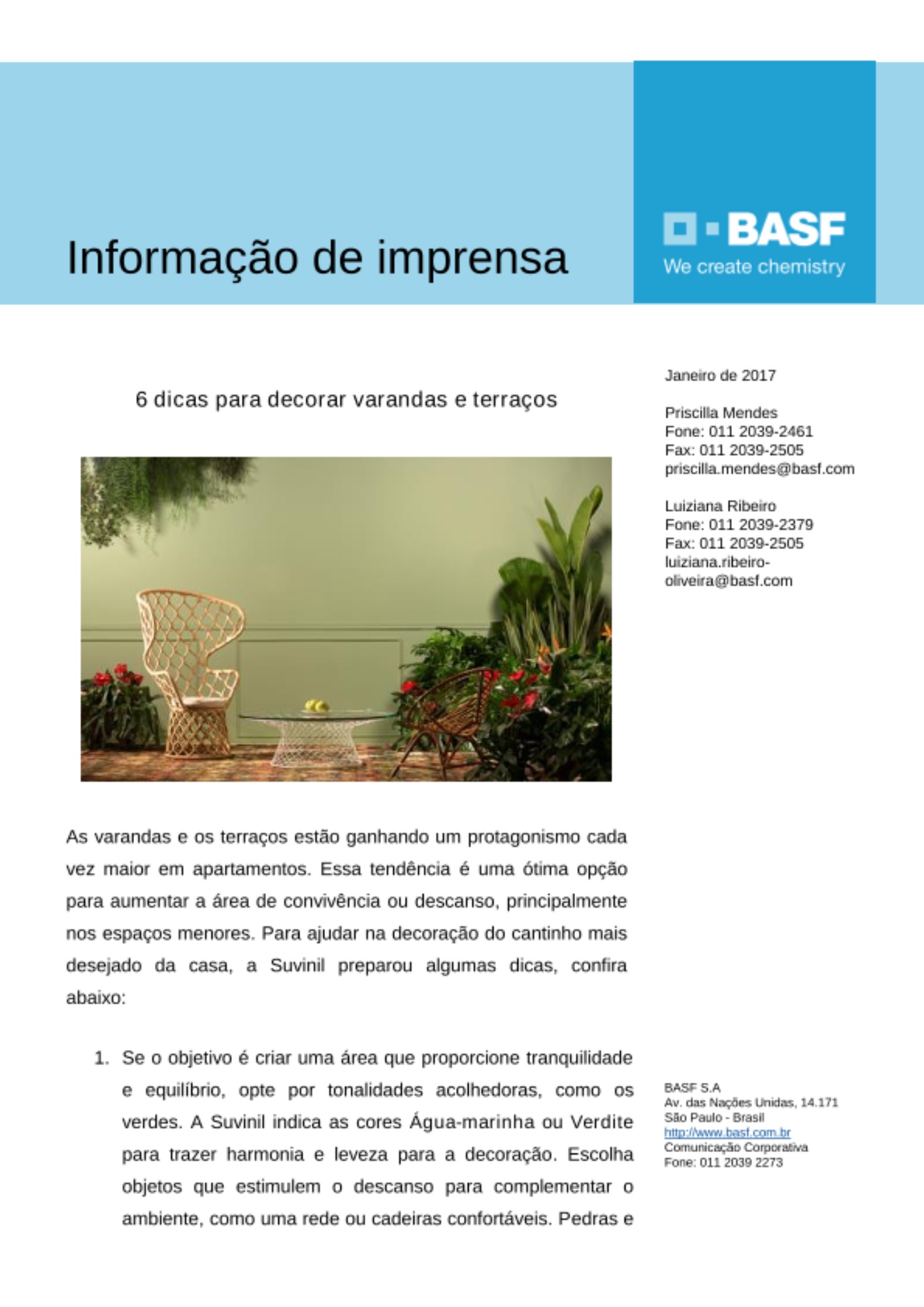 As varandas e os terraços estão ganhando um protagonismo cada vez maior em apartamentos. Essa tendência é uma ótima opção para aumentar a área de convivência ou descanso, principalmente nos espaços menores. Para ajudar na decoração do cantinho mais desejado da casa, a Suvinil preparou algumas dicas, confira abaixo: