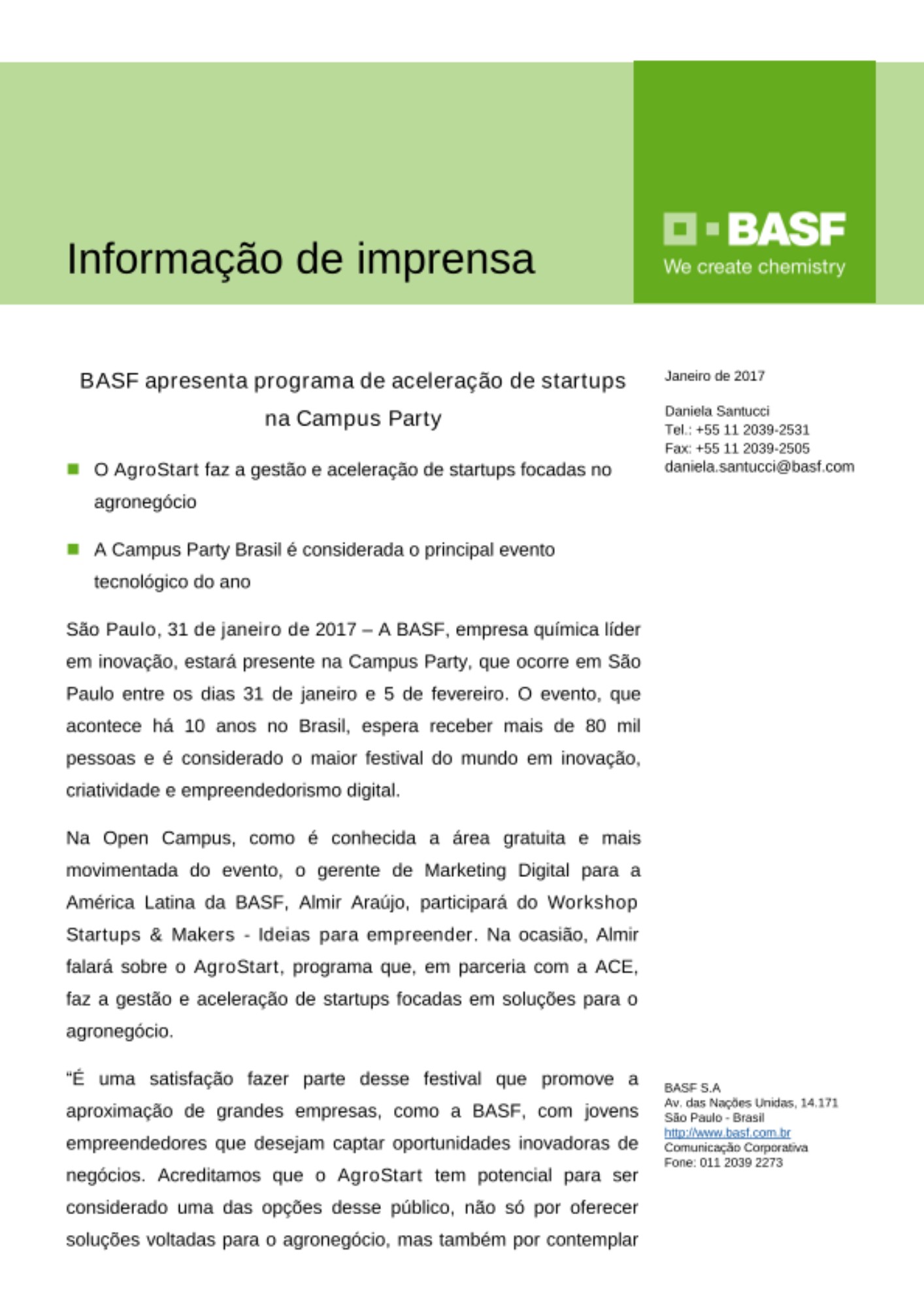 BASF, empresa química líder em inovação, estará presente na Campus Party, que ocorre em São Paulo entre os dias 31 de janeiro e 5 de fevereiro. O evento, que acontece há 10 anos no Brasil, espera receber mais de 80 mil pessoas e é considerado o maior festival do mundo em inovação, criatividade e empreendedorismo digital.