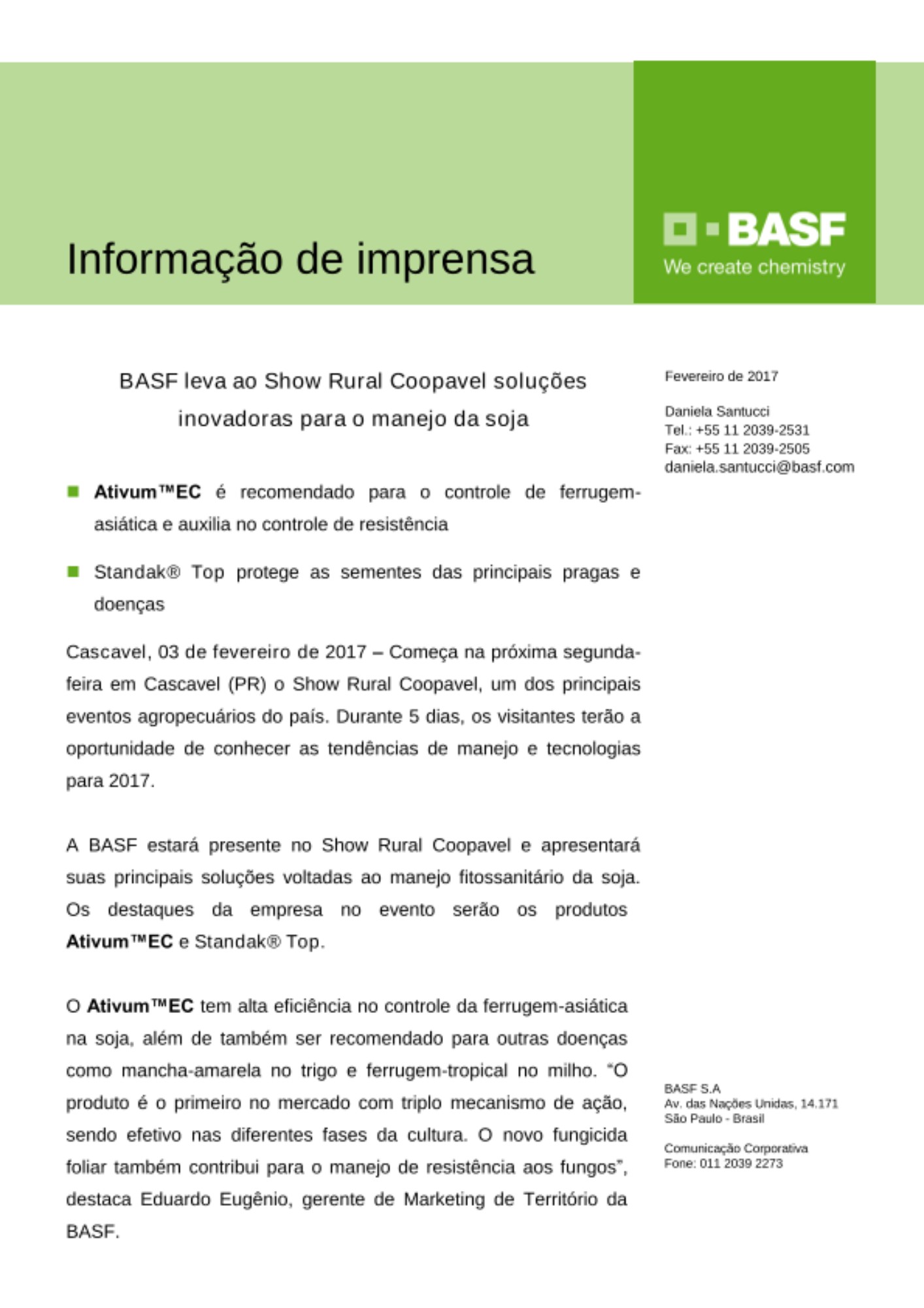 A BASF estará presente no Show Rural Coopavel e apresentará suas principais soluções voltadas ao manejo fitossanitário da soja. Os destaques da empresa no evento serão os produtos Ativum™EC e Standak® Top.