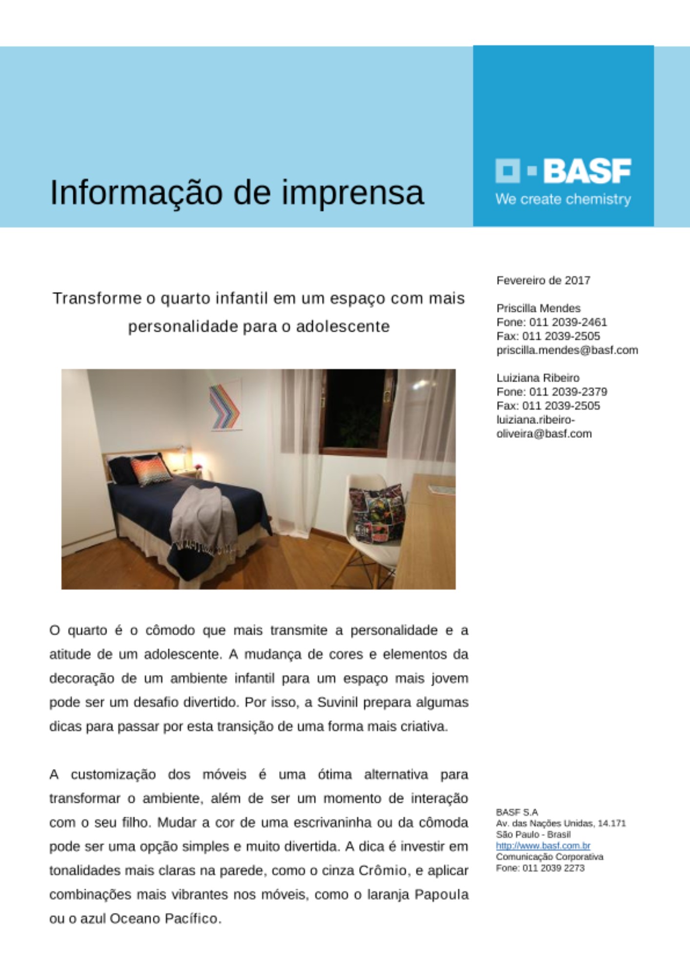 A Suvinil é a marca de tintas imobiliárias premium da BASF e lidera a participação no segmento. A marca tem uma estratégia de negócio consistente,