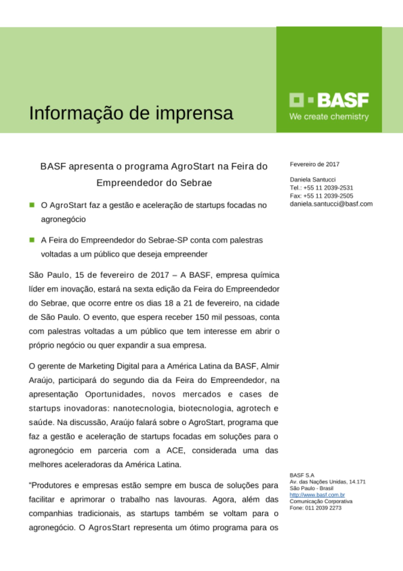 A BASF, empresa química líder em inovação, estará na sexta edição da Feira do Empreendedor do Sebrae, que ocorre entre os dias 18 a 21 de fevereiro, na cidade de São Paulo. O evento, que espera receber 150 mil pessoas, conta com palestras voltadas a um público que tem interesse em abrir o próprio negócio ou quer expandir a sua empresa.
