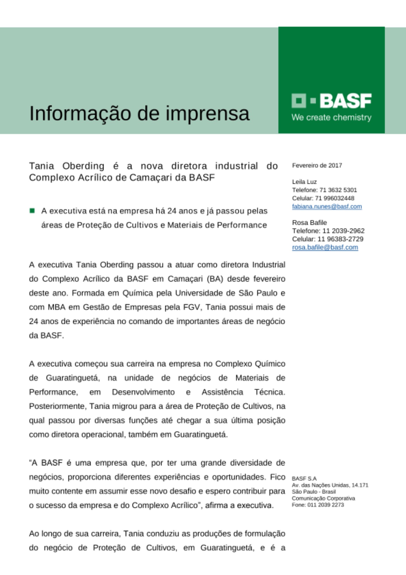 A executiva Tania Oberding passou a atuar como diretora Industrial do Complexo Acrílico da BASF em Camaçari (BA) desde fevereiro deste ano. Formada em Química pela Universidade de São Paulo e com MBA em Gestão de Empresas pela FGV, Tania possui mais de 24 anos de experiência no comando de importantes áreas de negócio da BASF.