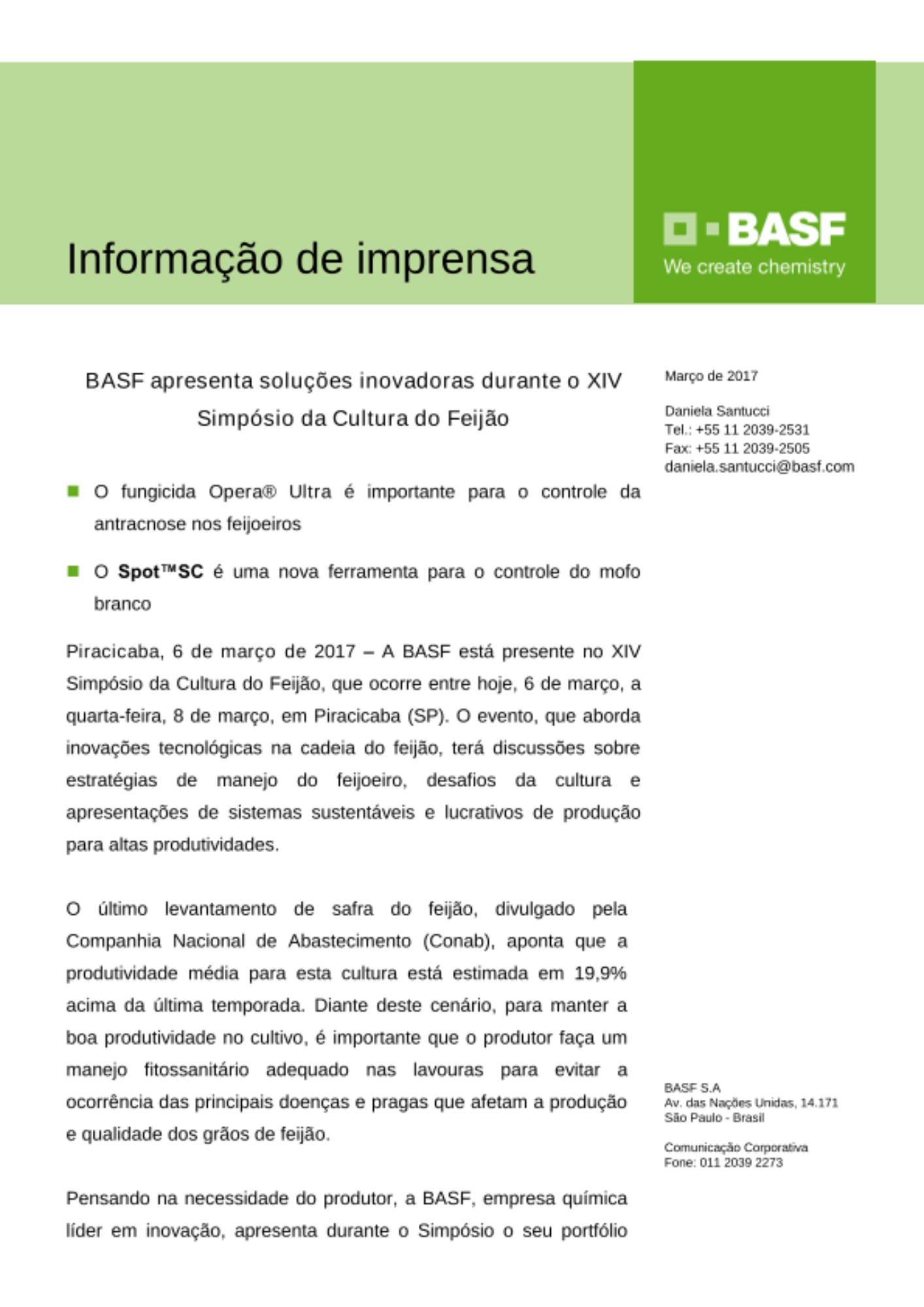 Pensando na necessidade do produtor, a BASF, empresa química líder em inovação, apresenta durante o Simpósio o seu portfólio completo para o cultivo do feijão, com destaque para as soluções Spot™SC e Opera® Ultra.