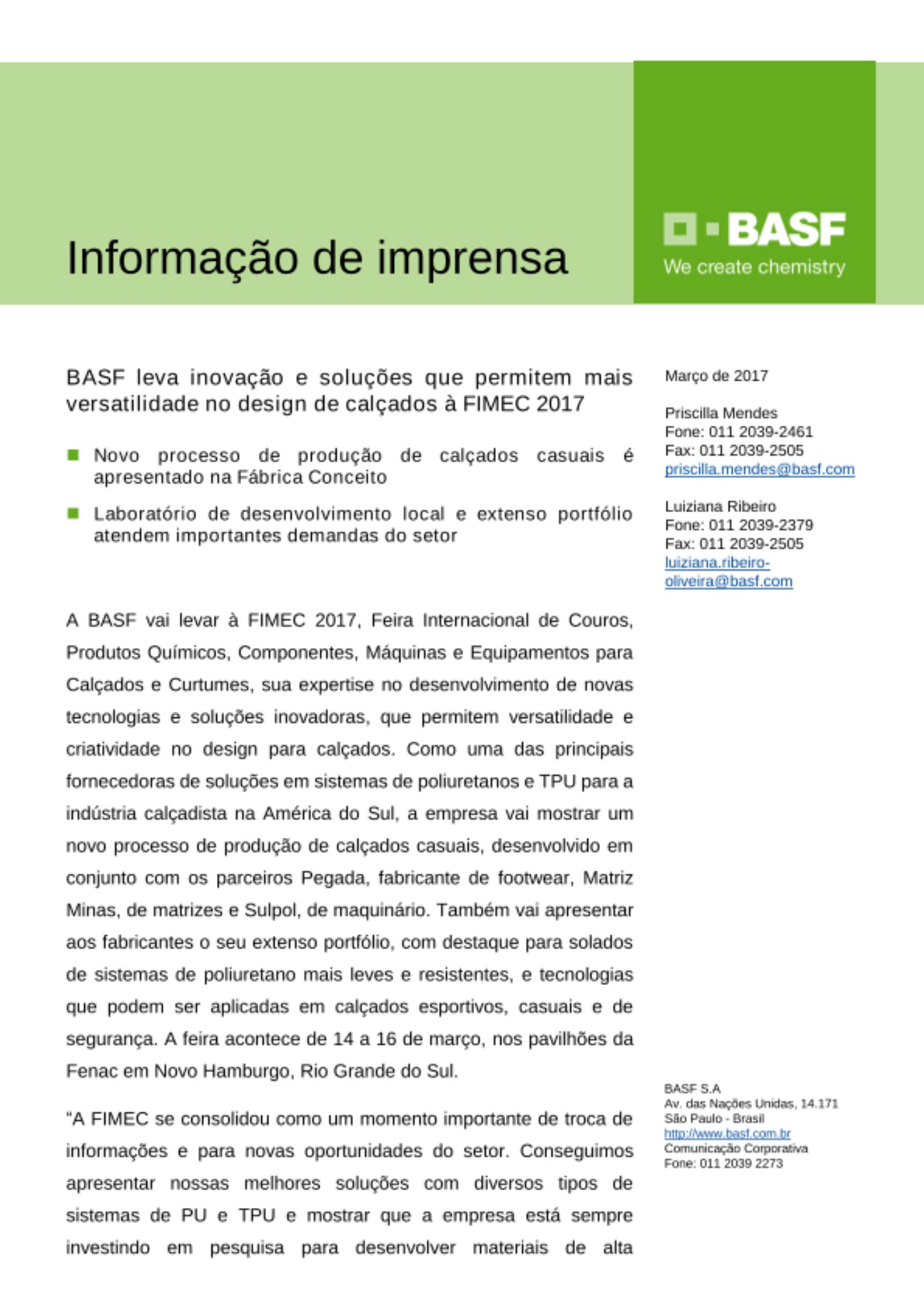 A BASF vai levar à FIMEC 2017, Feira Internacional de Couros, Produtos Químicos, Componentes, Máquinas e Equipamentos para Calçados e Curtumes, sua expertise no desenvolvimento de novas tecnologias e soluções inovadoras, que permitem versatilidade e criatividade no design para calçados. Como uma das principais fornecedoras de soluções em sistemas de poliuretanos e TPU para a indústria calçadista na América do Sul, a empresa vai mostrar um novo processo de produção de calçados casuais, desenvolvido em conjunto com os parceiros Pegada, fabricante de footwear, Matriz Minas, de matrizes e Sulpol, de maquinário. Também vai apresentar aos fabricantes o seu extenso portfólio, com destaque para solados de sistemas de poliuretano mais leves e resistentes, e tecnologias que podem ser aplicadas em calçados esportivos, casuais e de segurança. A feira acontece de 14 a 16 de março, nos pavilhões da Fenac em Novo Hamburgo, Rio Grande do Sul.