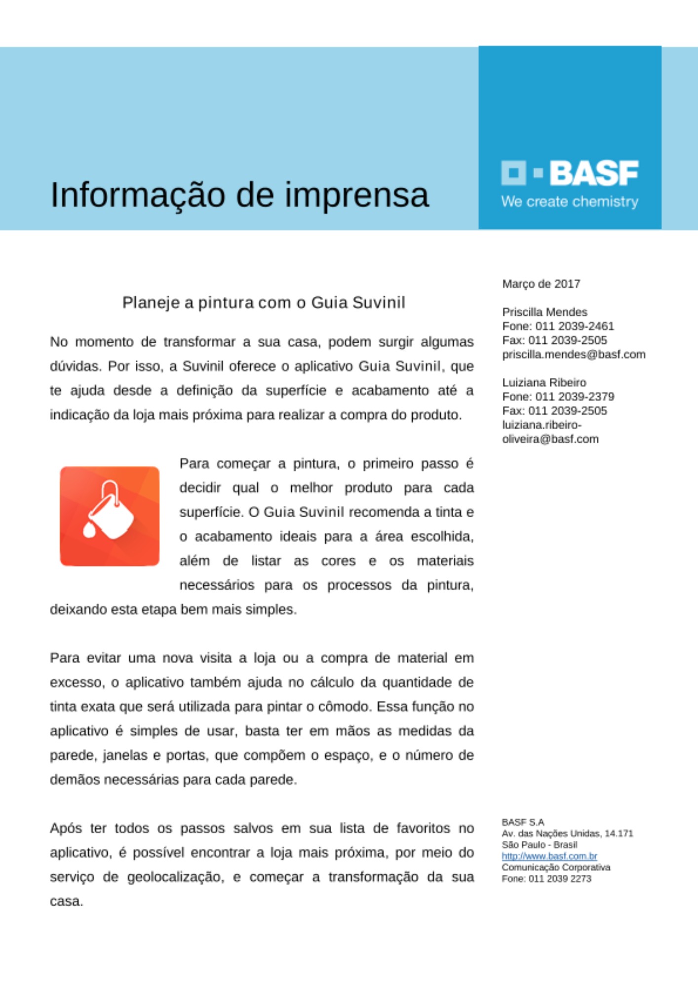 A Suvinil é a marca de tintas imobiliárias premium BASF e lidera a participação no segmento. A marca tem uma estratégia de negócio consistente, pautada em relacionamento com clientes, inovação e fortes investimentos. Adquirida em 1969 pela BASF, que entrava no ramo de tintas globalmente, a Suvinil possui mais de 50 anos de boas práticas, que resultaram numa completa linha de produtos constituída por látex PVA, acrílicos, esmaltes, vernizes, epóxi e complementos para pintura. Seu portfólio, produzido nas fábricas instaladas em São Bernardo do Campo (SP) e Jaboatão dos Guararapes (PE), atende todo o mercado nacional.