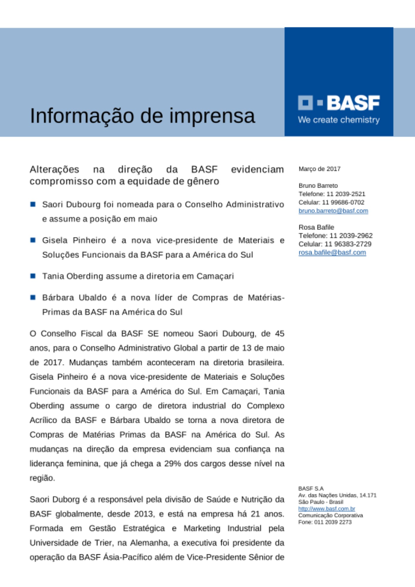 O Conselho Fiscal da BASF SE nomeou Saori Dubourg, de 45 anos, para o Conselho Administrativo Global a partir de 13 de maio de 2017. Mudanças também aconteceram na diretoria brasileira. Gisela Pinheiro é a nova vice-presidente de Materiais e Soluções Funcionais da BASF para a América do Sul. Em Camaçari, Tania Oberding assume o cargo de diretora industrial do Complexo Acrílico da BASF e Bárbara Ubaldo se torna a nova diretora de Compras de Matérias Primas da BASF na América do Sul. As mudanças na direção da empresa evidenciam sua confiança na liderança feminina, que já chega a 29% dos cargos desse nível na região.