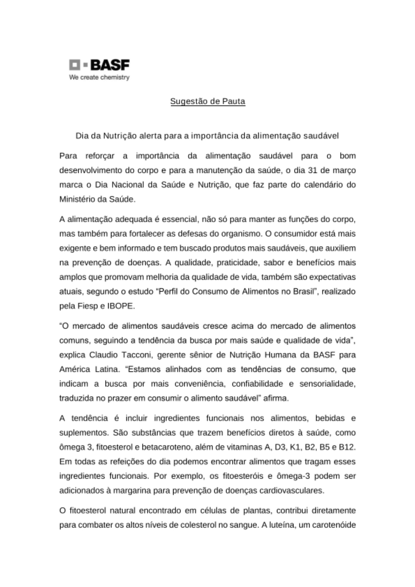 “O mercado de alimentos saudáveis cresce acima do mercado de alimentos comuns, seguindo a tendência da busca por mais saúde e qualidade de vida”, explica Claudio Tacconi, gerente sênior de Nutrição Humana da BASF para América Latina. “Estamos alinhados com as tendências de consumo, que indicam a busca por mais conveniência, confiabilidade e sensorialidade, traduzida no prazer em consumir o alimento saudável” afirma.