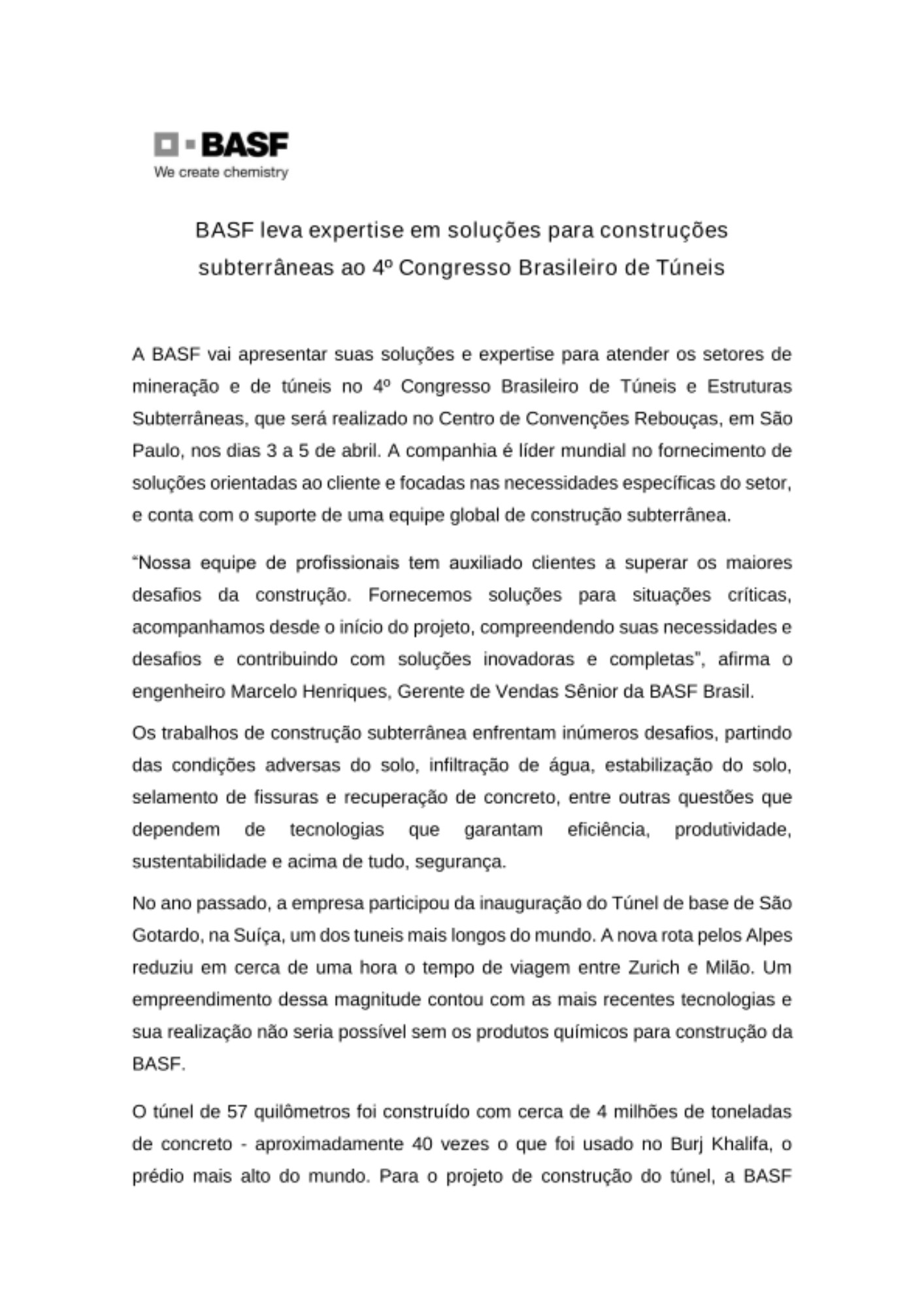 A BASF vai apresentar suas soluções e expertise para atender os setores de mineração e de túneis no 4º Congresso Brasileiro de Túneis e Estruturas Subterrâneas, que será realizado no Centro de Convenções Rebouças, em São Paulo, nos dias 3 a 5 de abril. A companhia é líder mundial no fornecimento de soluções orientadas ao cliente e focadas nas necessidades específicas do setor, e conta com o suporte de uma equipe global de construção subterrânea.