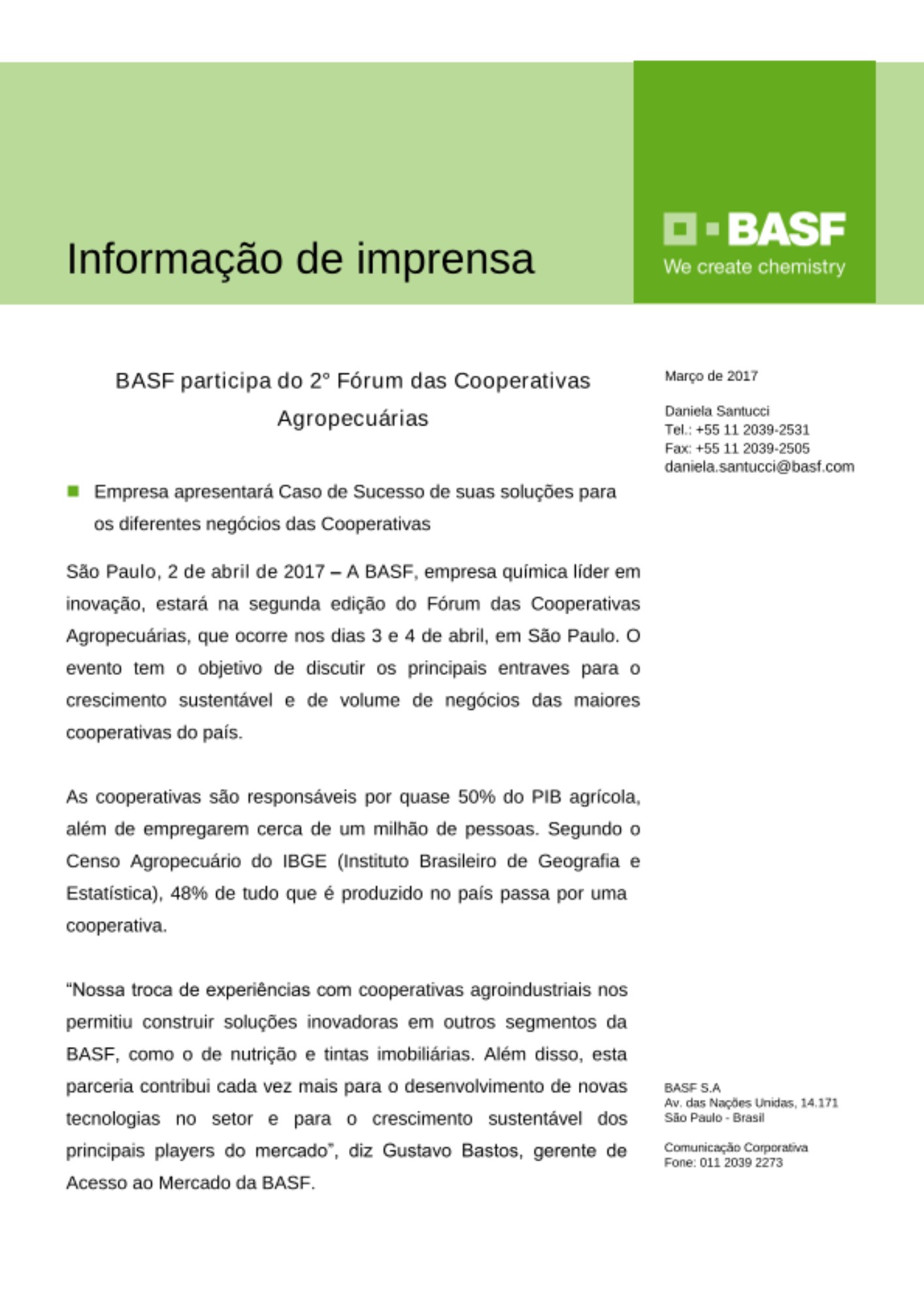 A BASF, empresa química líder em inovação, estará na segunda edição do Fórum das Cooperativas Agropecuárias, que ocorre nos dias 3 e 4 de abril, em São Paulo. O evento tem o objetivo de discutir os principais entraves para o crescimento sustentável e de volume de negócios das maiores cooperativas do país.