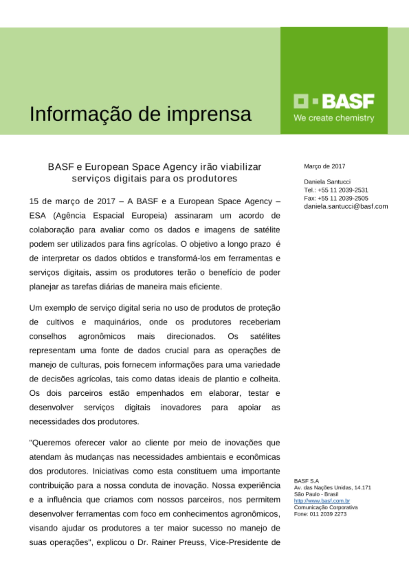Na BASF, nós transformamos a química para um futuro sustentável. Nós combinamos o sucesso econômico com a proteção ambiental e responsabilidade social. O Grupo BASF conta com aproximadamente 114 mil colaboradores que trabalham para contribuir com o sucesso de nossos clientes em quase todos os setores e países do mundo. Nosso portfólio é organizado em 5 segmentos: Químicos, Produtos de Performance, Materiais e Soluções Funcionais, Soluções para Agricultura e Petróleo e Gás. A BASF gerou vendas de mais de € 58 bilhões em 2016. As ações da BASF são comercializadas no mercado de ações de Frankfurt (BAS), Londres (BFA) e Zurich (AN). Para mais informações, acesse: www.basf.com.br.