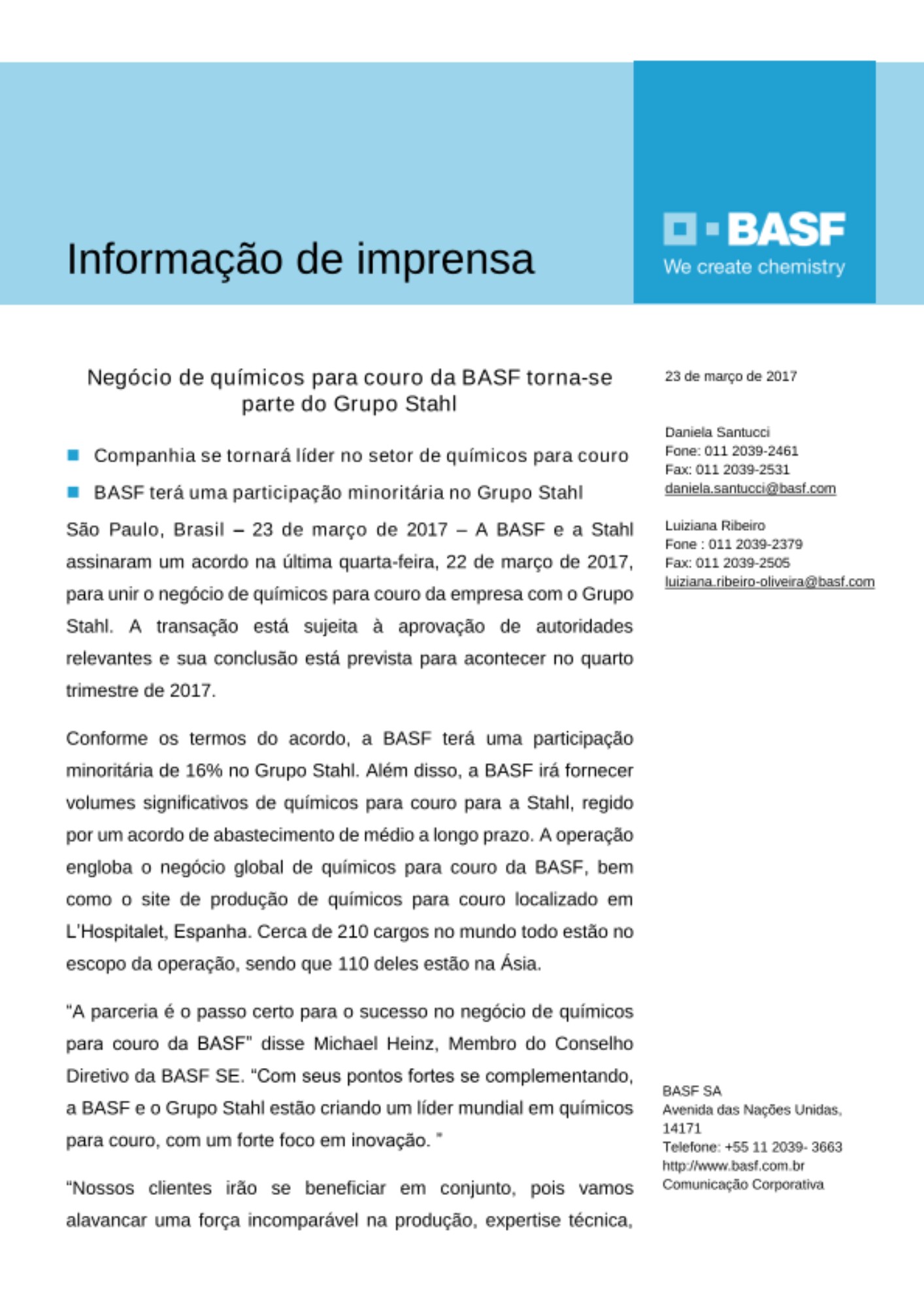 A BASF e a Stahl assinaram um acordo na última quarta-feira, 22 de março de 2017, para unir o negócio de químicos para couro da empresa com o Grupo Stahl. A transação está sujeita à aprovação de autoridades relevantes e sua conclusão está prevista para acontecer no quarto trimestre de 2017.