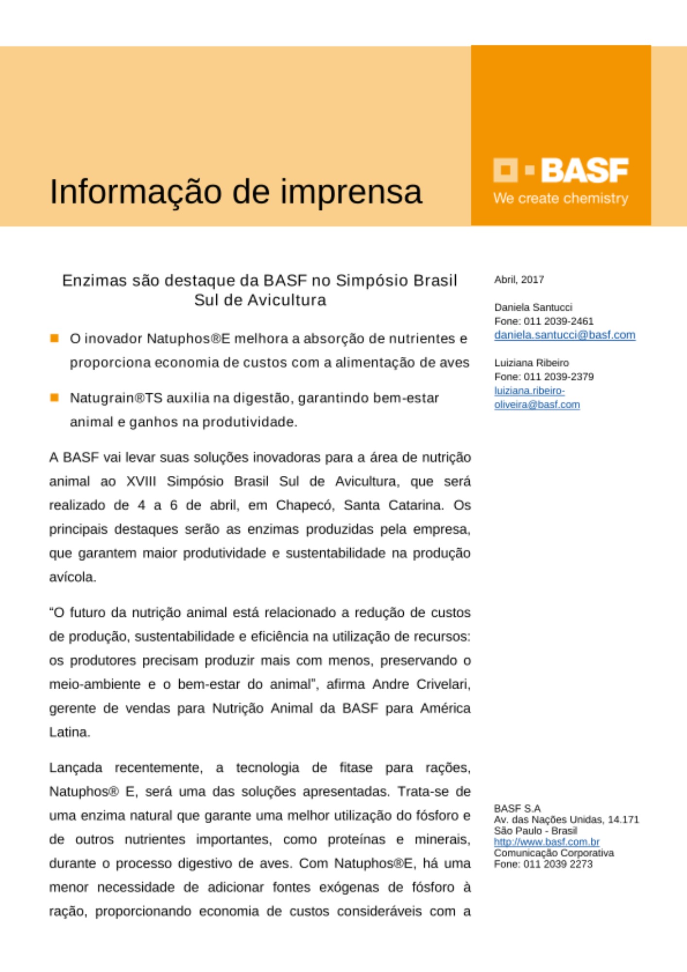 A BASF vai levar suas soluções inovadoras para a área de nutrição animal ao XVIII Simpósio Brasil Sul de Avicultura, que será realizado de 4 a 6 de abril, em Chapecó, Santa Catarina. Os principais destaques serão as enzimas produzidas pela empresa, que garantem maior produtividade e sustentabilidade na produção avícola.