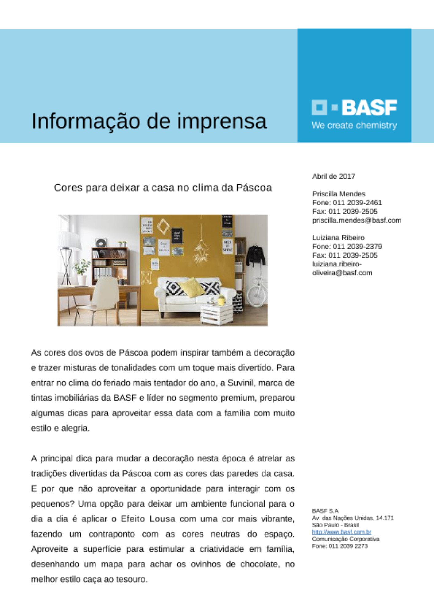 As cores dos ovos de Páscoa podem inspirar também a decoração e trazer misturas de tonalidades com um toque mais divertido. Para entrar no clima do feriado mais tentador do ano, a Suvinil, marca de tintas imobiliárias da BASF e líder no segmento premium, preparou algumas dicas para aproveitar essa data com a família com muito estilo e alegria.
