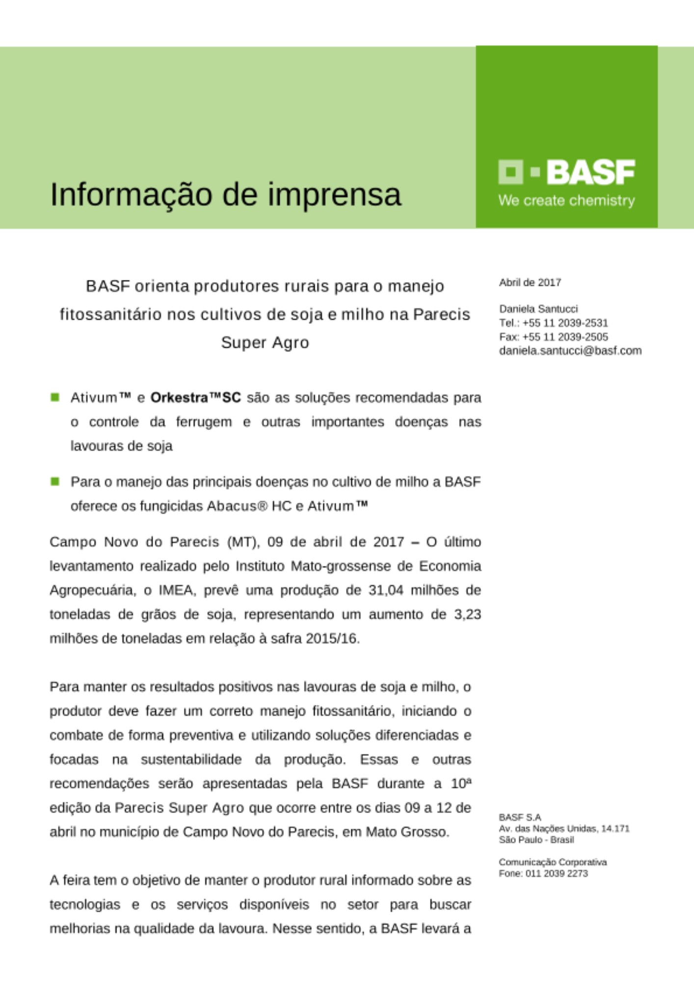 Prezado jornalista, favor contatar a BASF, por meio de sua área da Comunicação Corporativa, em caso de informações sobre os produtos e sua correta aplicação. Uso exclusivamente agrícola. Aplique somente as doses recomendadas. Descarte corretamente as embalagens e restos de produtos. Incluir outros métodos de controle do programa do Manejo Integrado de Pragas (MIP) quando disponíveis e apropriados. Os produtos Ativum™, Orkestra™SC, Standak® Top e Abacus® HC estão devidamente registrados no Ministério da Agricultura, Pecuária e Abastecimento sob os números: 11216, 08813, 01209 e 9210.