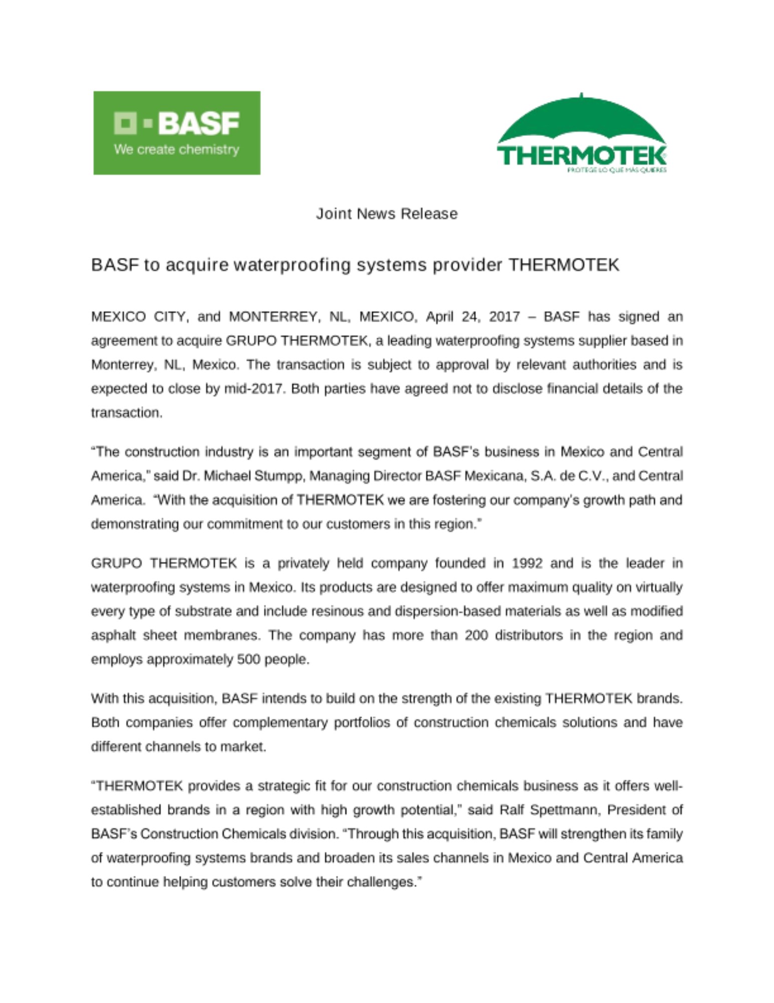 CIDADE DO MÉXICO e MONTERREY, NL, MÉXICO, 24 de abril de 2017 – A BASF assinou um acordo para adquirir o GRUPO THERMOTEK, um dos principais fornecedores de sistemas de impermeabilização, com sede em Monterrey, NL, México. A operação está sujeita à aprovação das autoridades competentes e deverá ser concluída em meados de 2017. Ambas as partes concordaram em não divulgar os detalhes financeiros da operação.