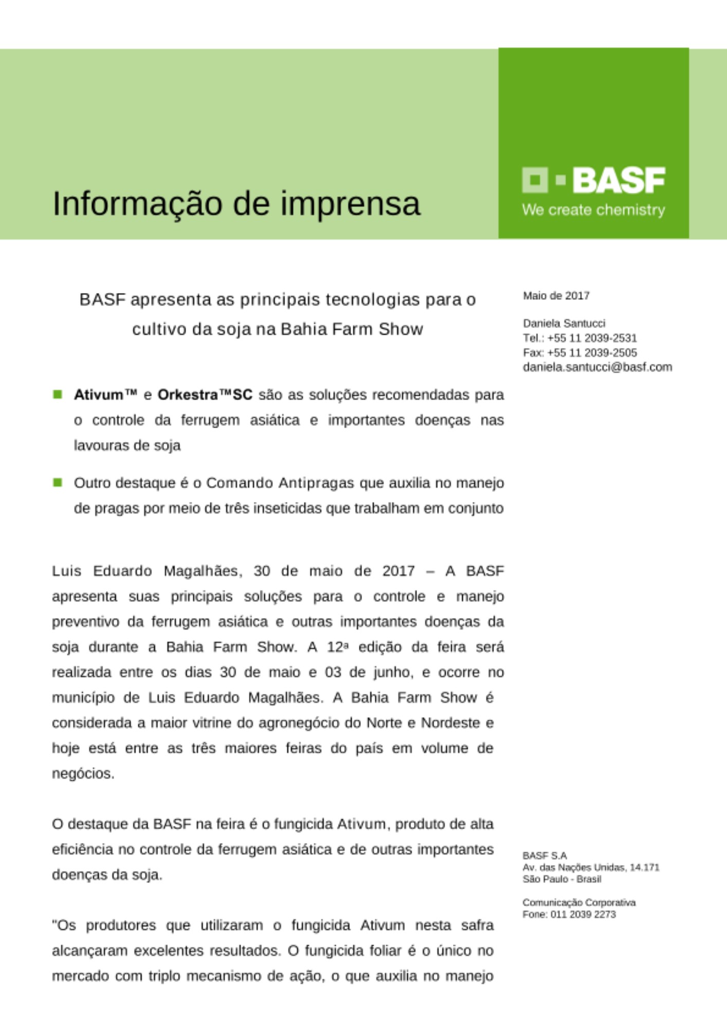 Prezado jornalista, favor contatar a BASF, por meio de sua área da Comunicação Corporativa, em caso de informações sobre os produtos e sua correta aplicação. Uso exclusivamente agrícola. Aplique somente as doses recomendadas. Descarte corretamente as embalagens e restos de produtos. Incluir outros métodos de controle do programa do Manejo Integrado de Pragas (MIP) quando disponíveis e apropriados. Os produtos Ativum, Orkestra™SC, Fastac® Duo, Pirate® e Nomolt® 150 estão devidamente registrados no Ministério da Agricultura, Pecuária e Abastecimento sob os números: 11216, 08813, 10913, 05898 e 01393.